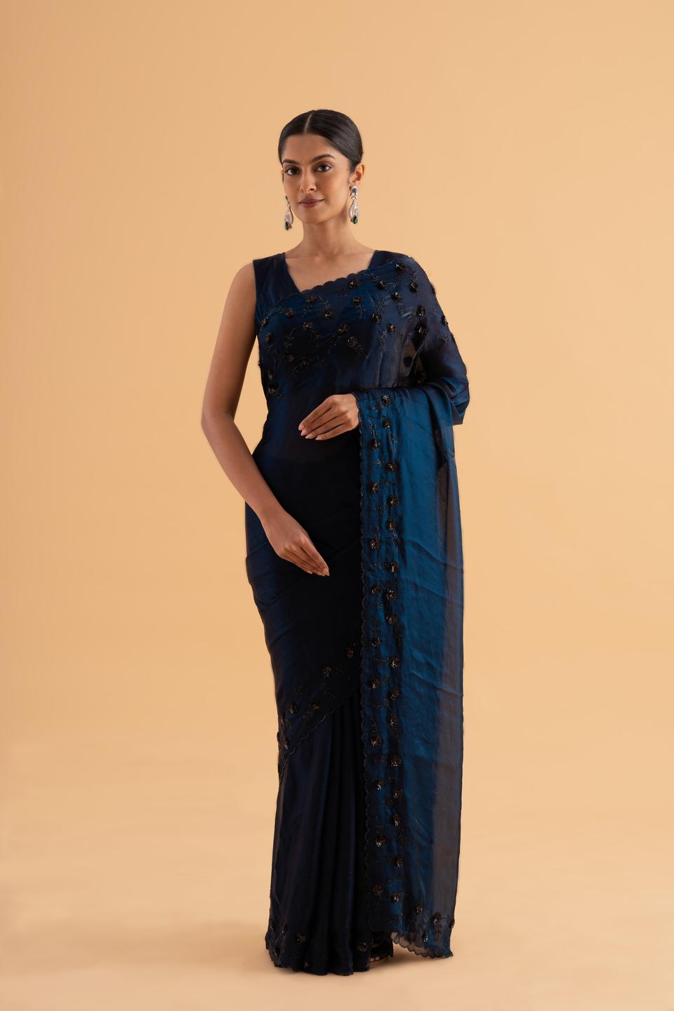 Wrap yourself in midnight magic. This Midnight Blue saree, crafted from glowing stardust satin, is enhanced with dazzling sequin and beadwork, creating a constellation-like effect. An ideal pick for festive nights and high-glam celebrations.
