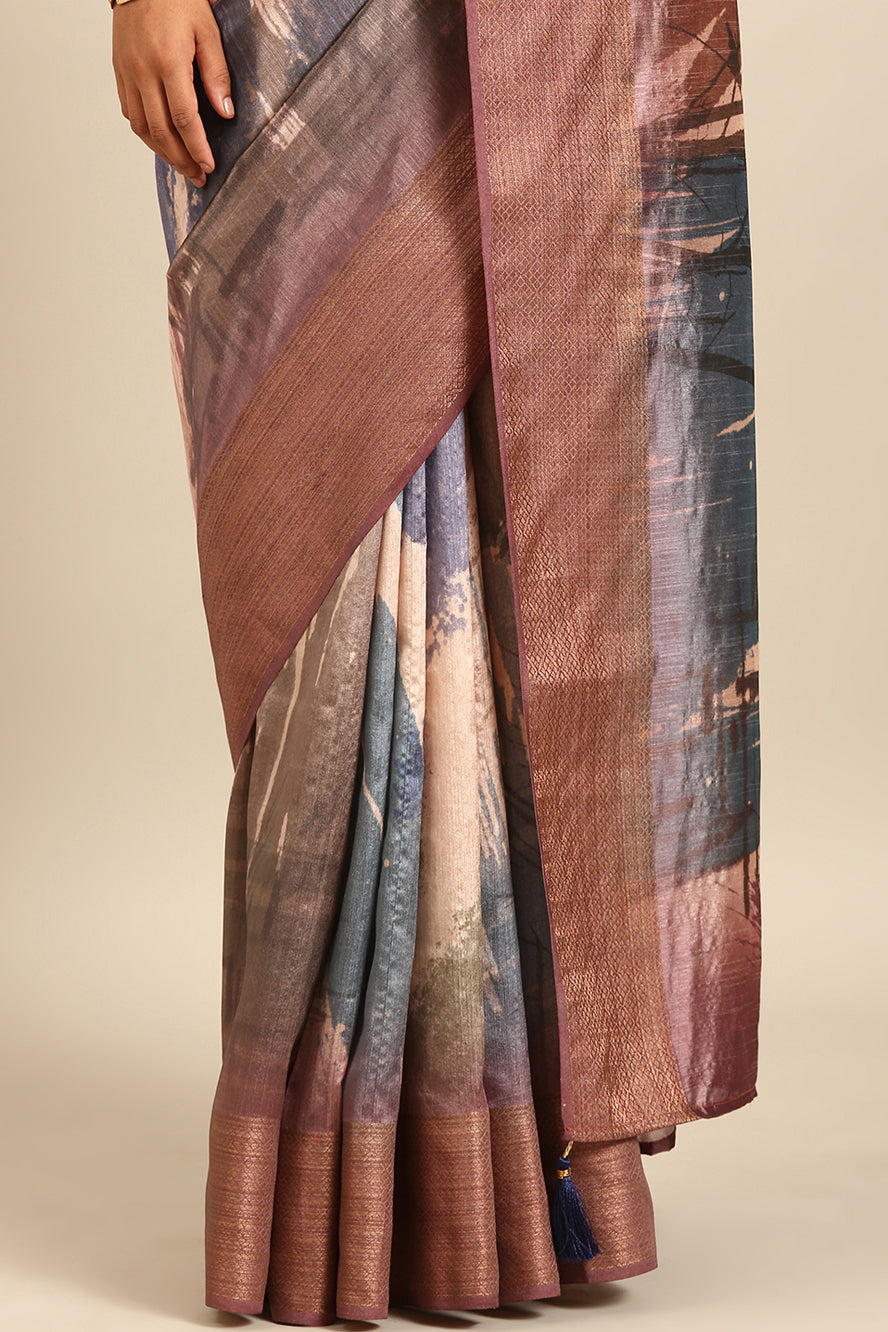 Drape yourself in the fluid elegance of this blue Tussar silk saree. Its all-over print and classic zari border create a look of understated sophistication, making it an ideal choice for adding a touch of handcrafted charm to any day. Modern, comfortable, and unforgettable.