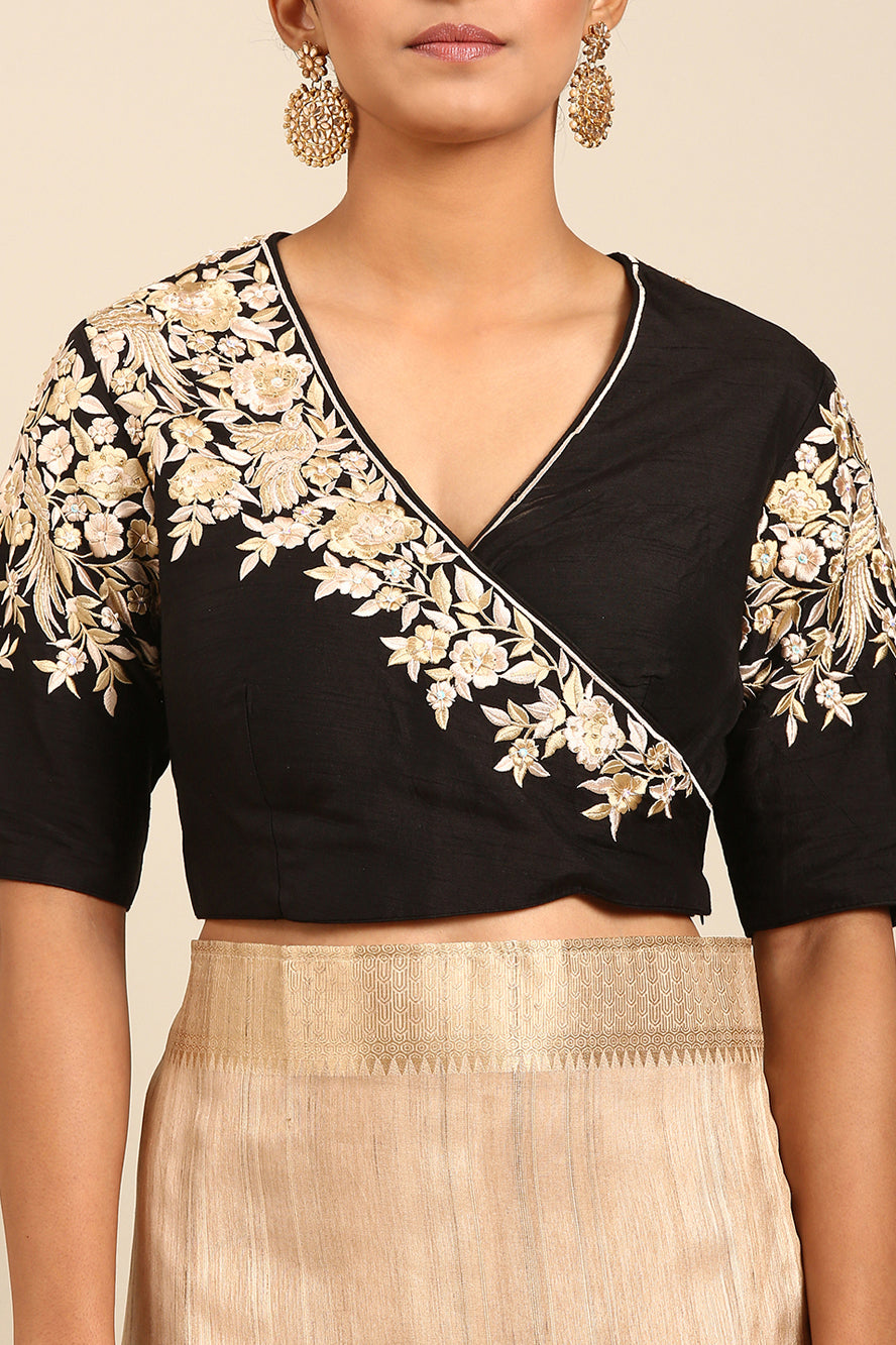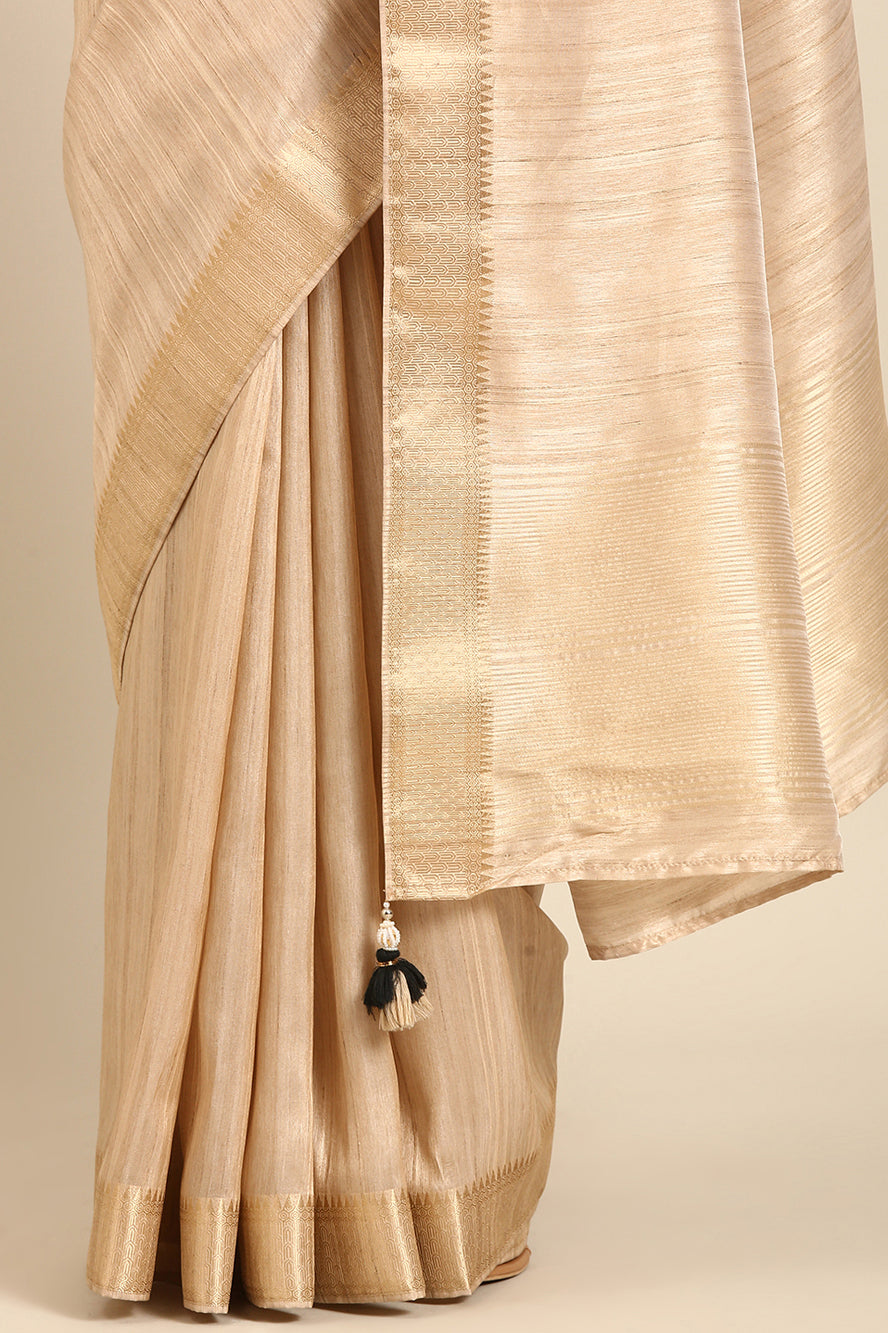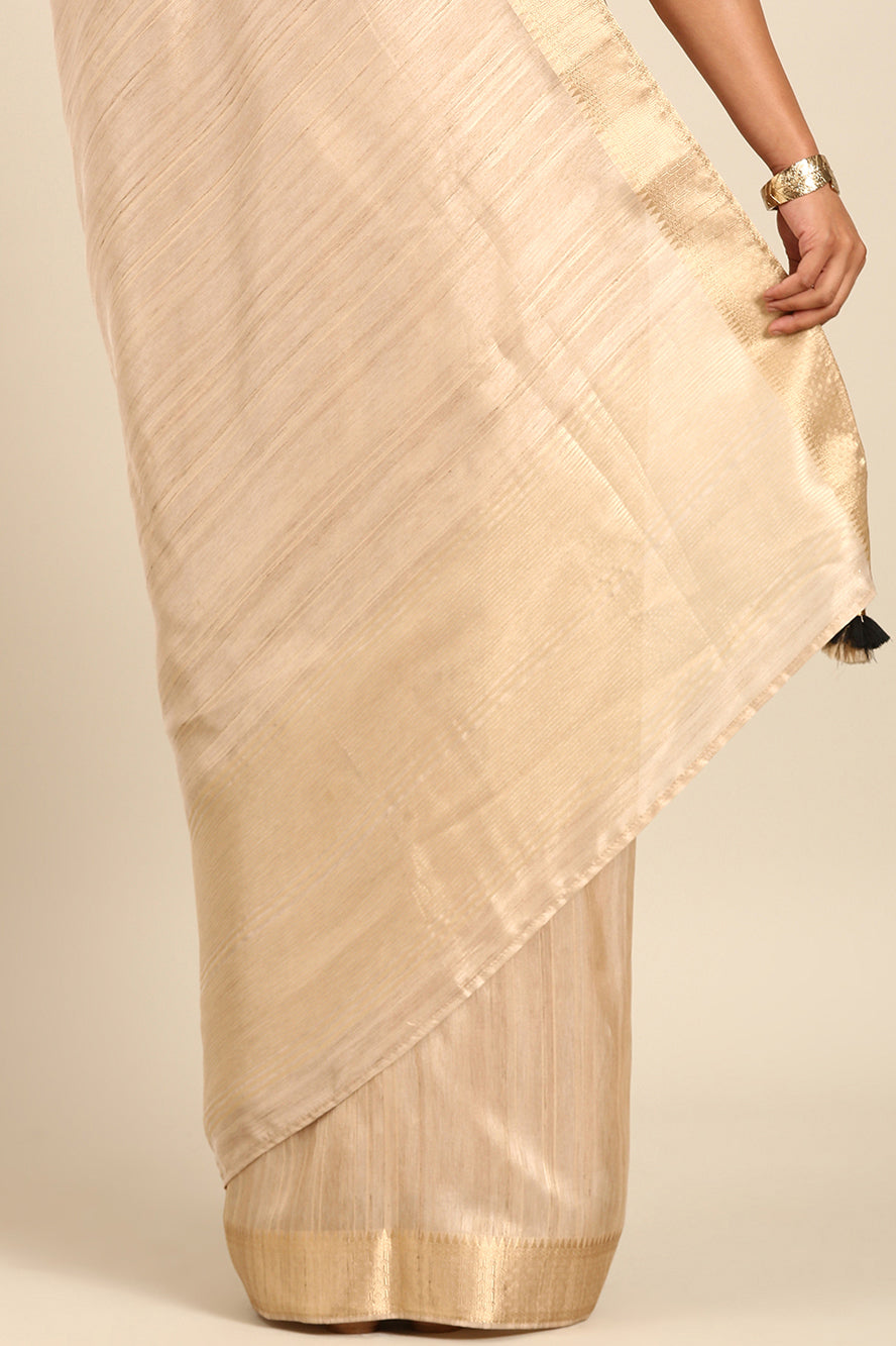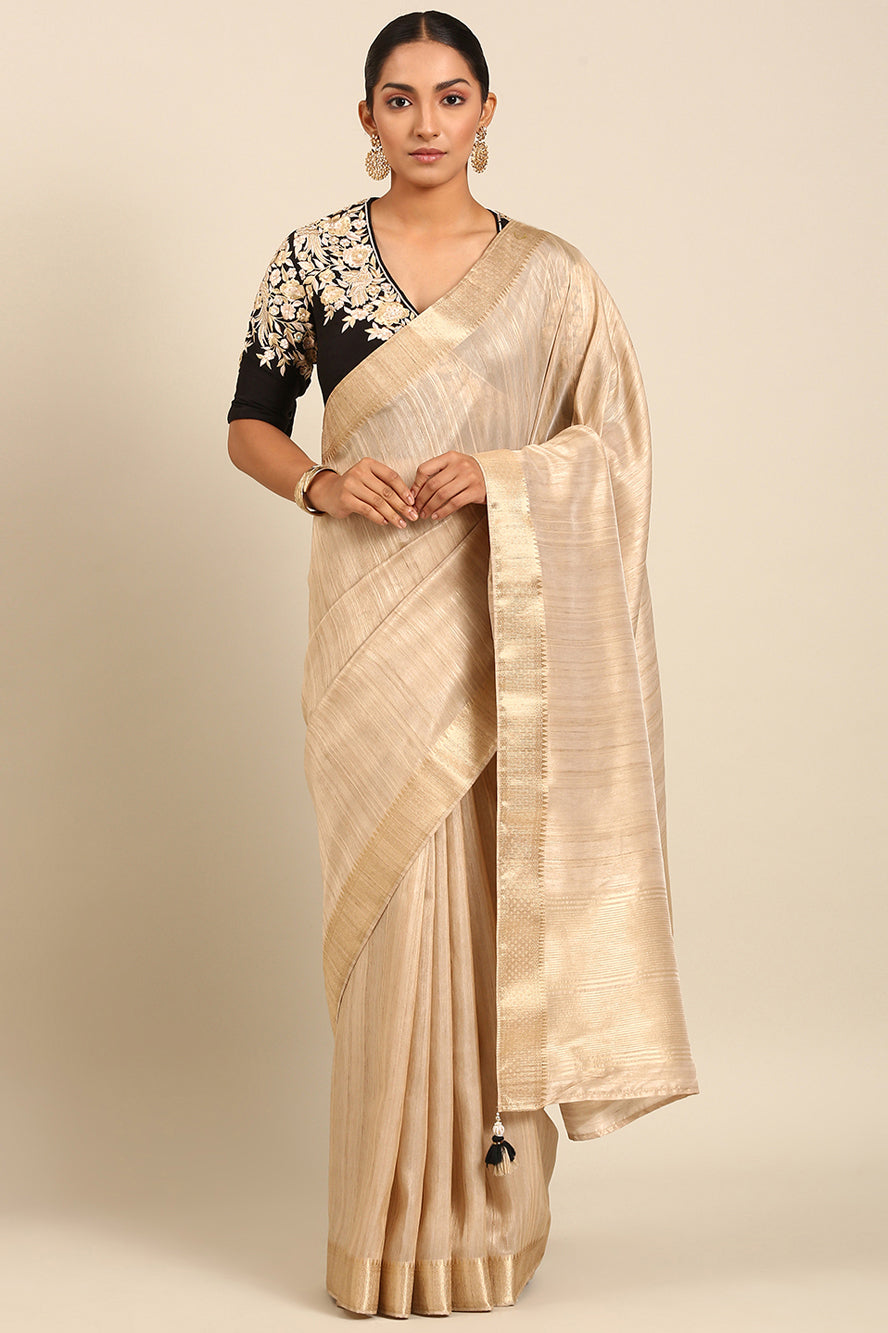 Step into timeless sophistication with this solid cream linen-blended silk saree. Its structured yet soft drape and classic zari border offer a minimalist elegance, perfectly accented with a matching black blouse. Ideal for formal events, office wear, or creating a polished, modern ethnic look.
