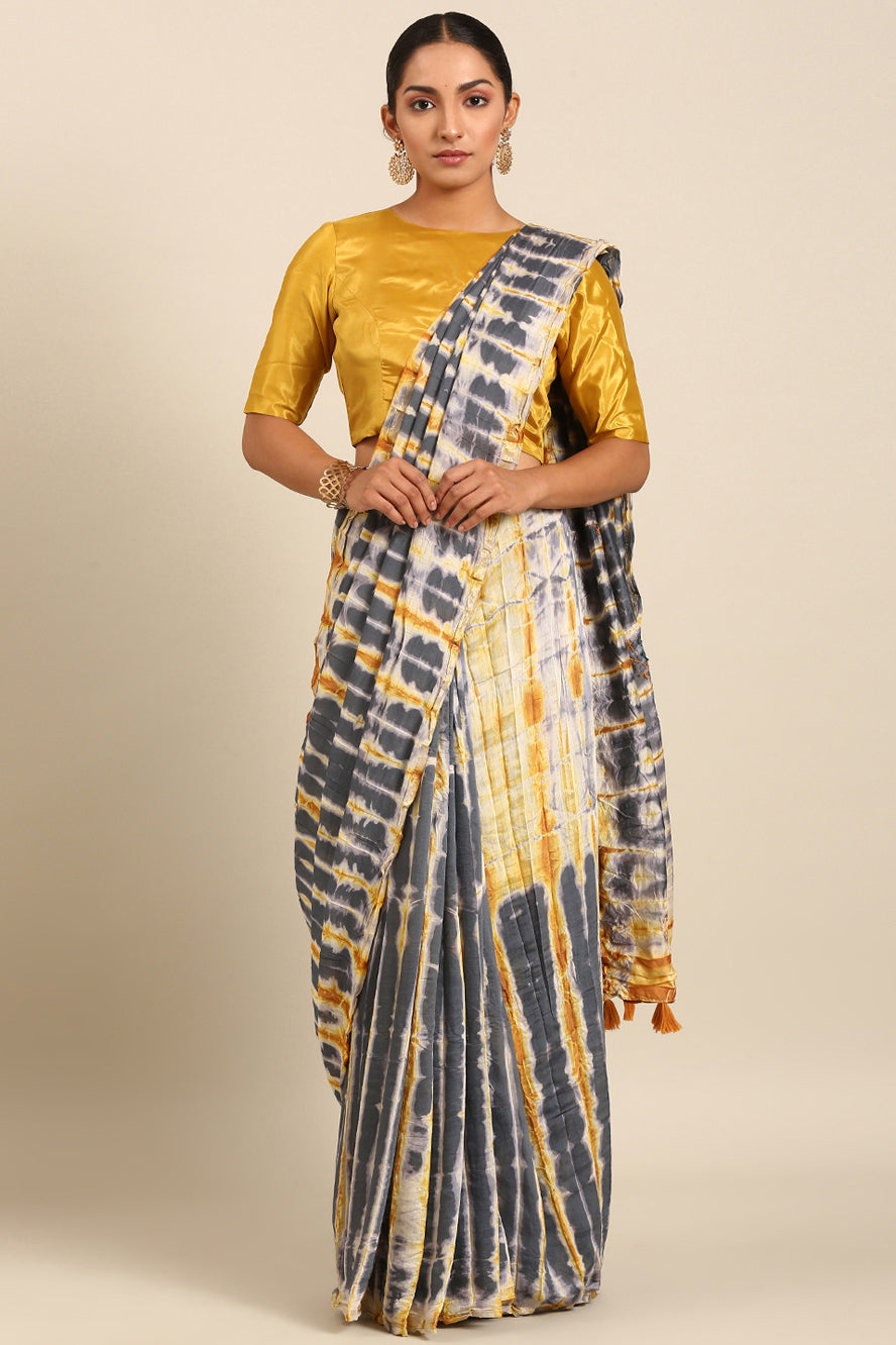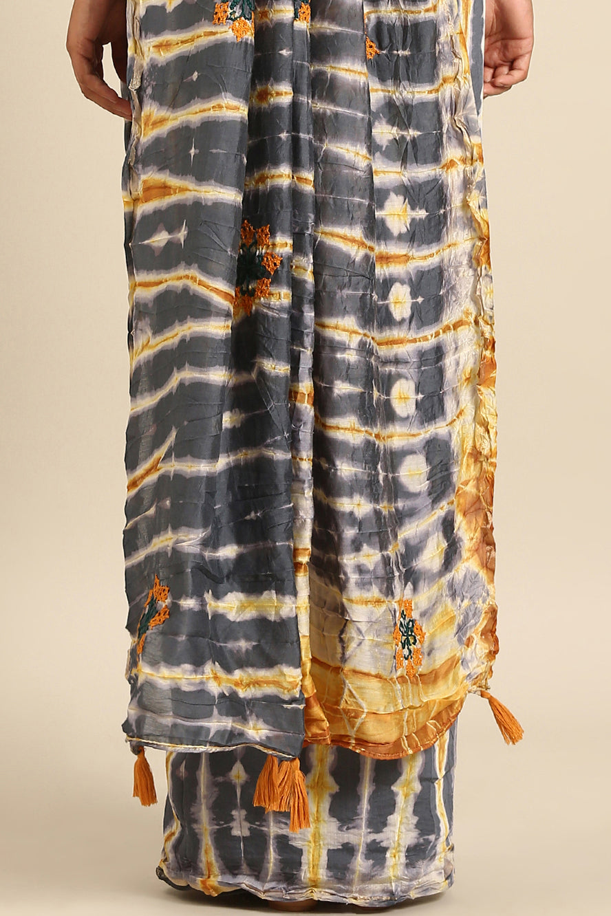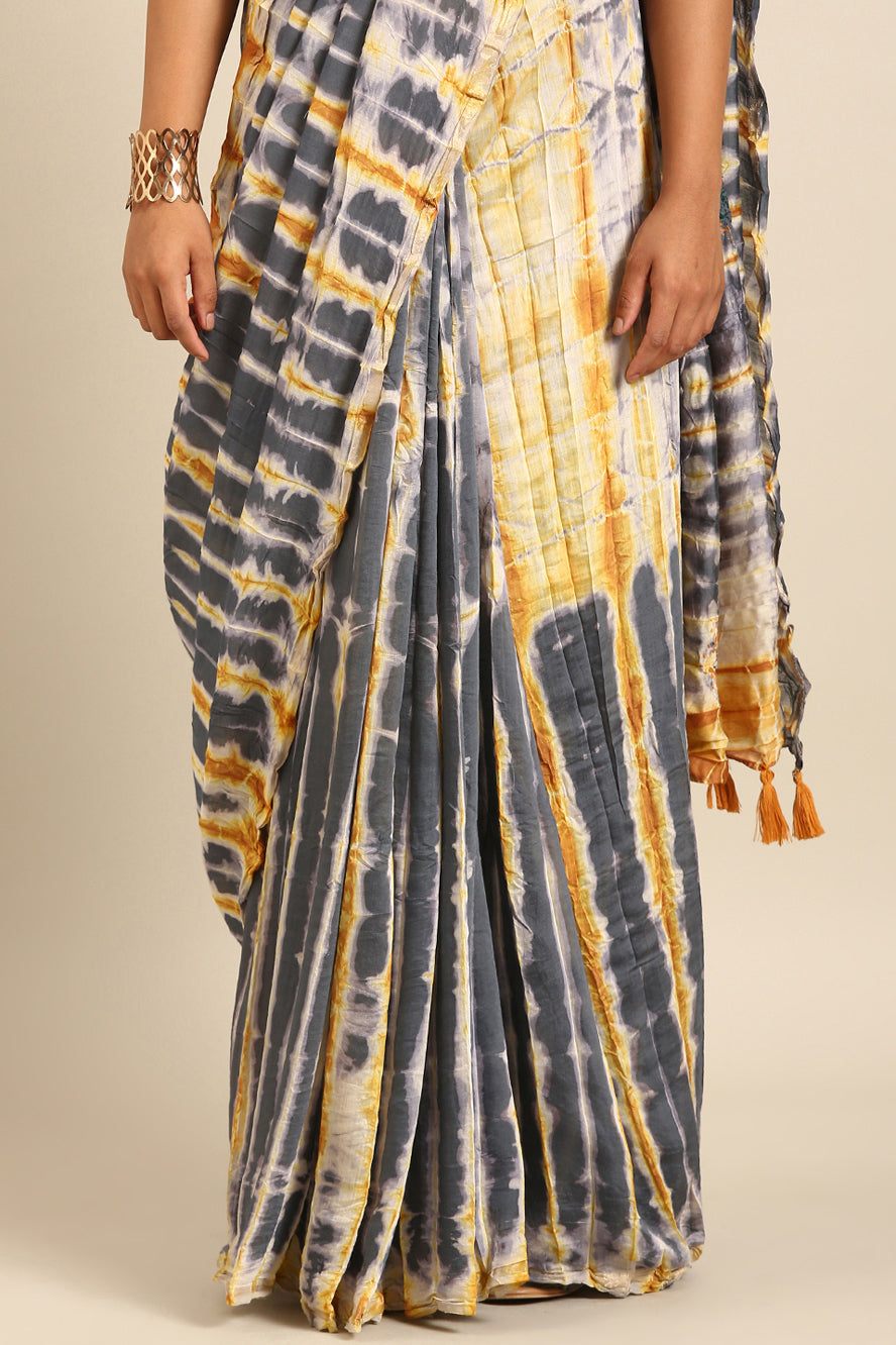 Urban elegance defined. A steel grey and yellow abstract print gives this Chanderi cotton saree a distinctly contemporary edge. The gold zari border and kutchi work provide a perfect balance of structure and artistry.