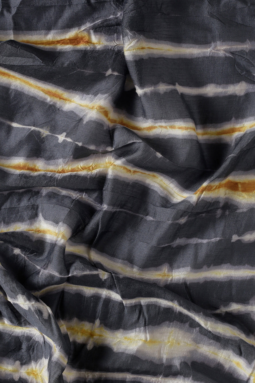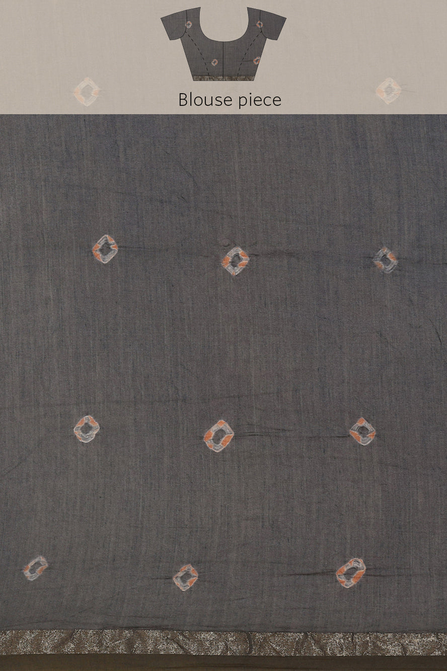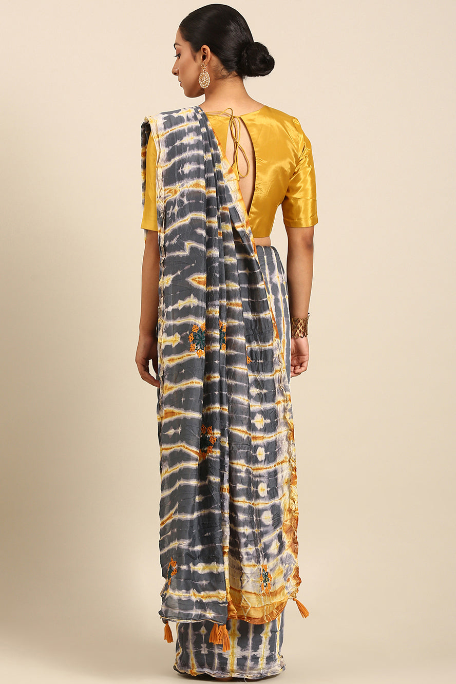 Urban elegance defined. A steel grey and yellow abstract print gives this Chanderi cotton saree a distinctly contemporary edge. The gold zari border and kutchi work provide a perfect balance of structure and artistry.