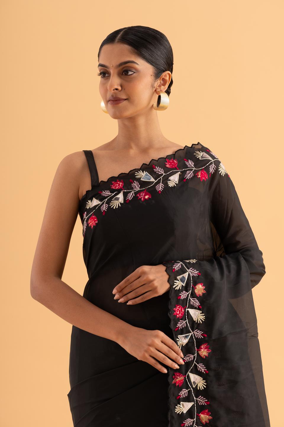 This sari is crafted from fine, lightweight organza that offers a sheer and graceful drape. Highlighted with elegant Jerquin work on the fabric, it combines delicate artistry with modern wearability.