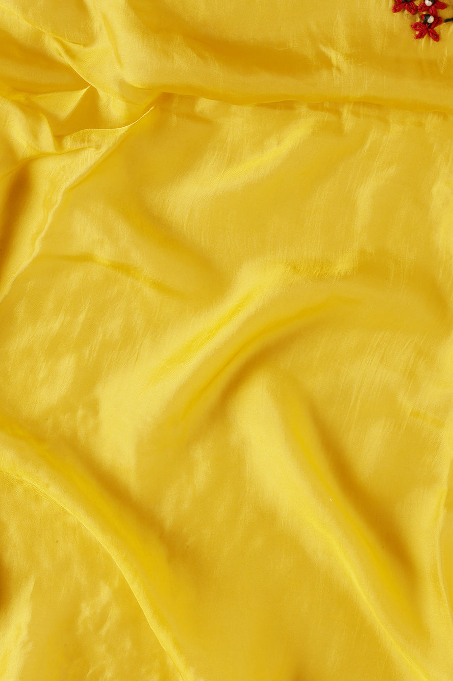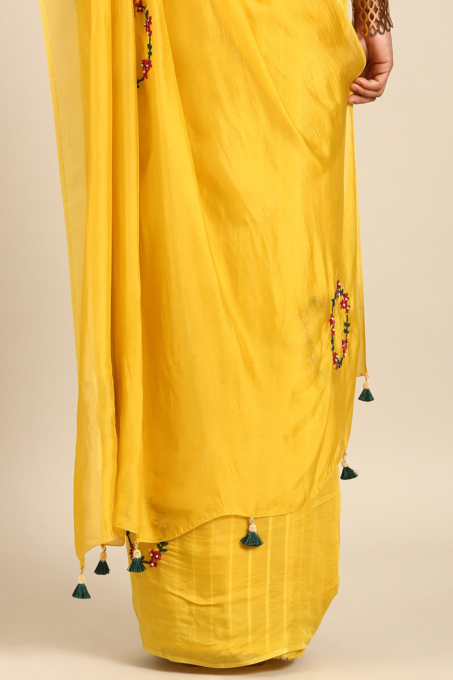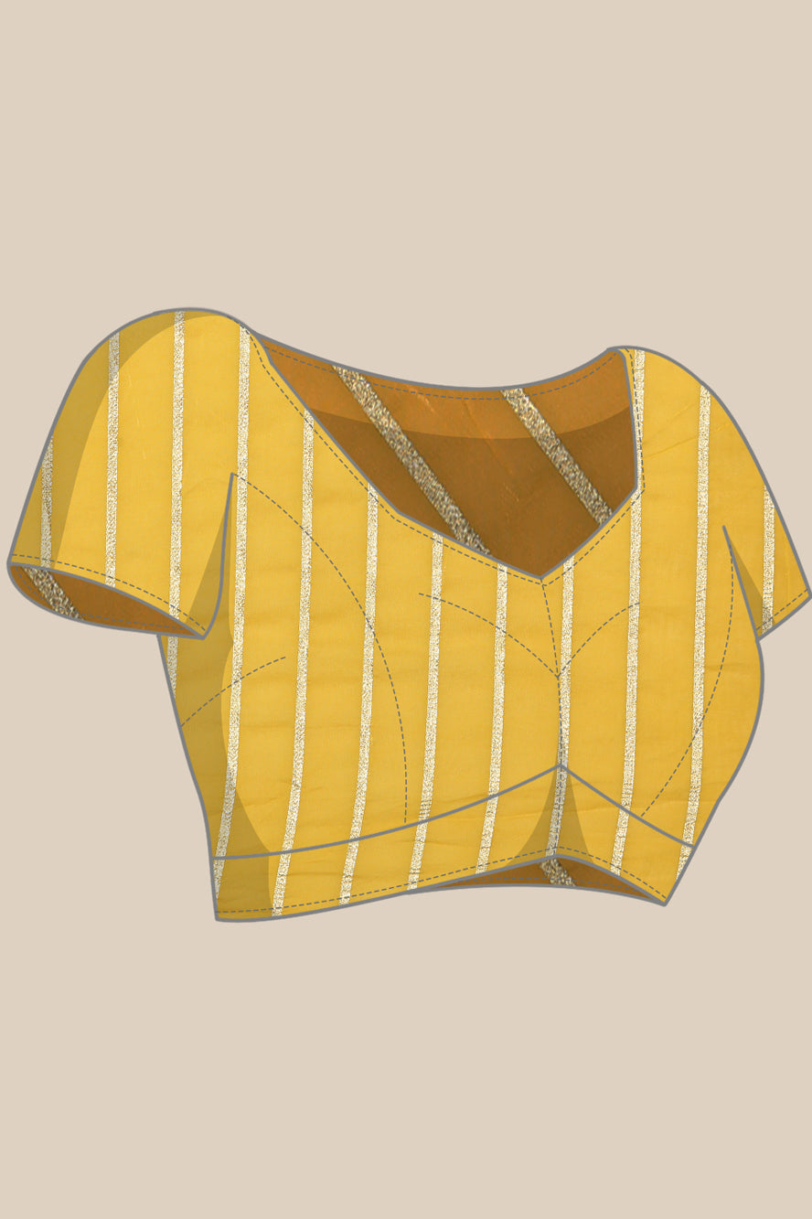 Experience the rich sheen of Gajji silk. This saree glows in a solid yellow, adorned with intricate all-over thread work and a gold zari border. It’s a flawless blend of traditional texture and modern silhouette.