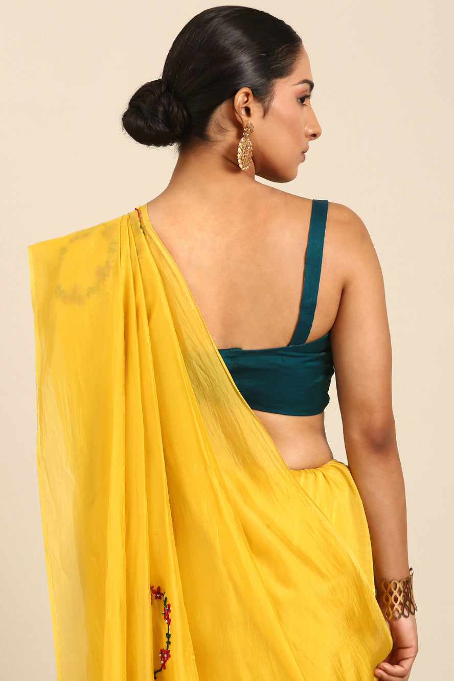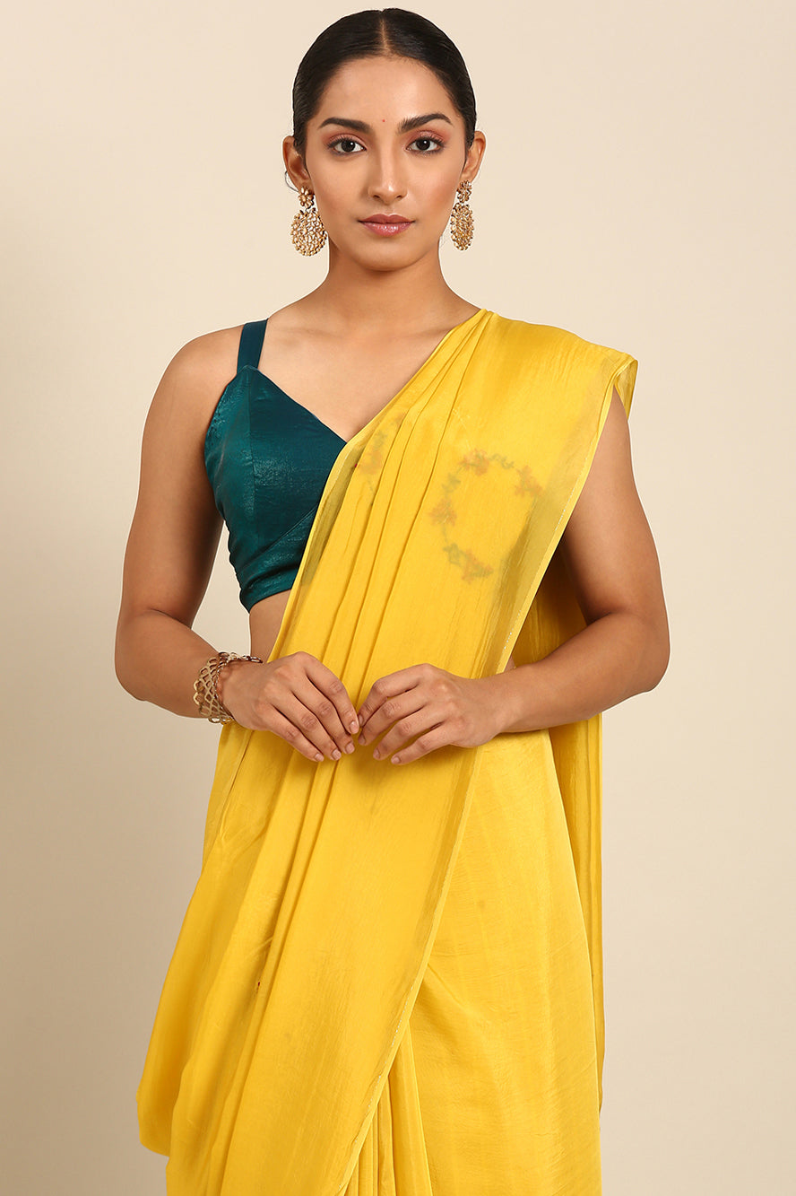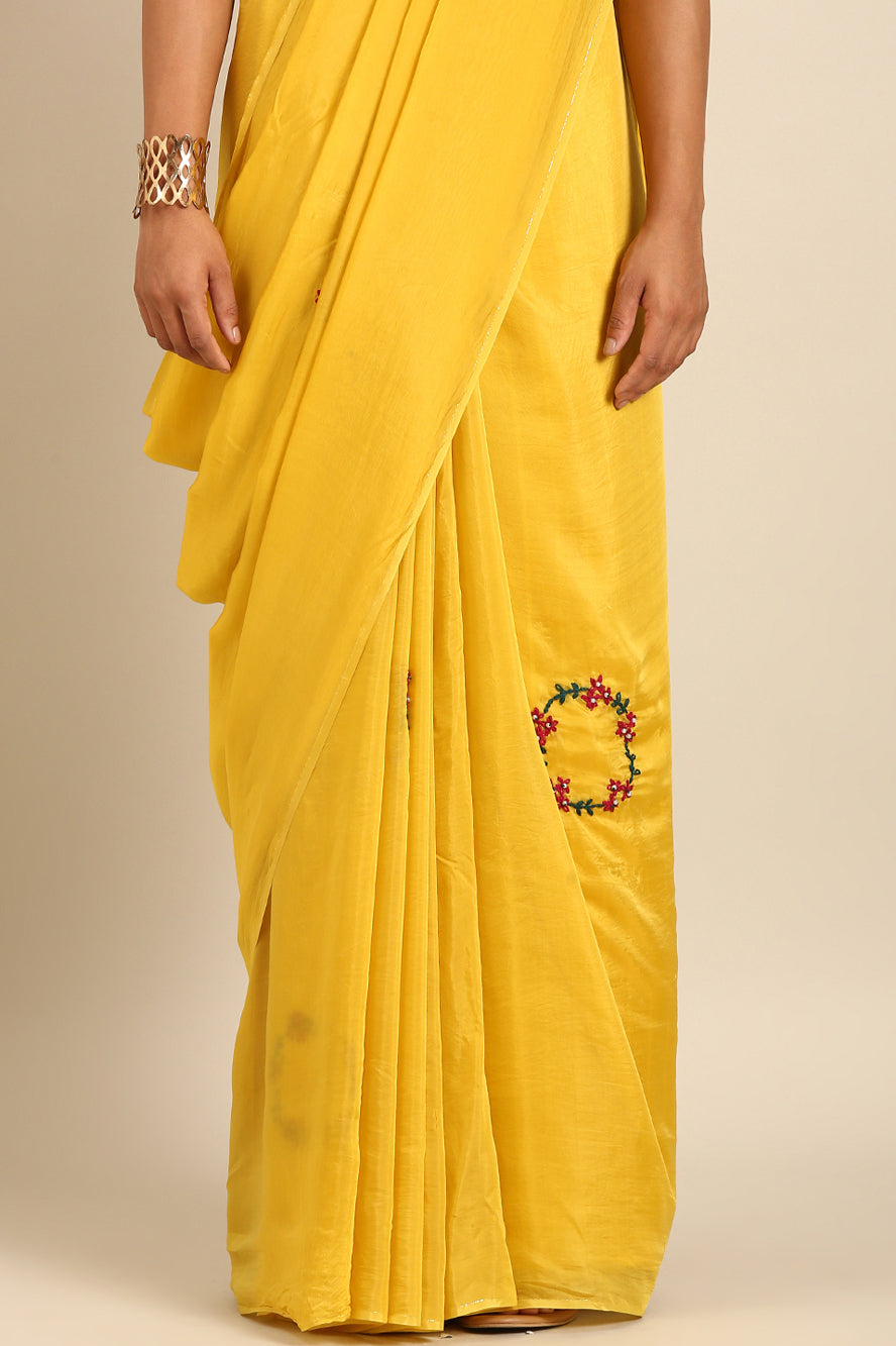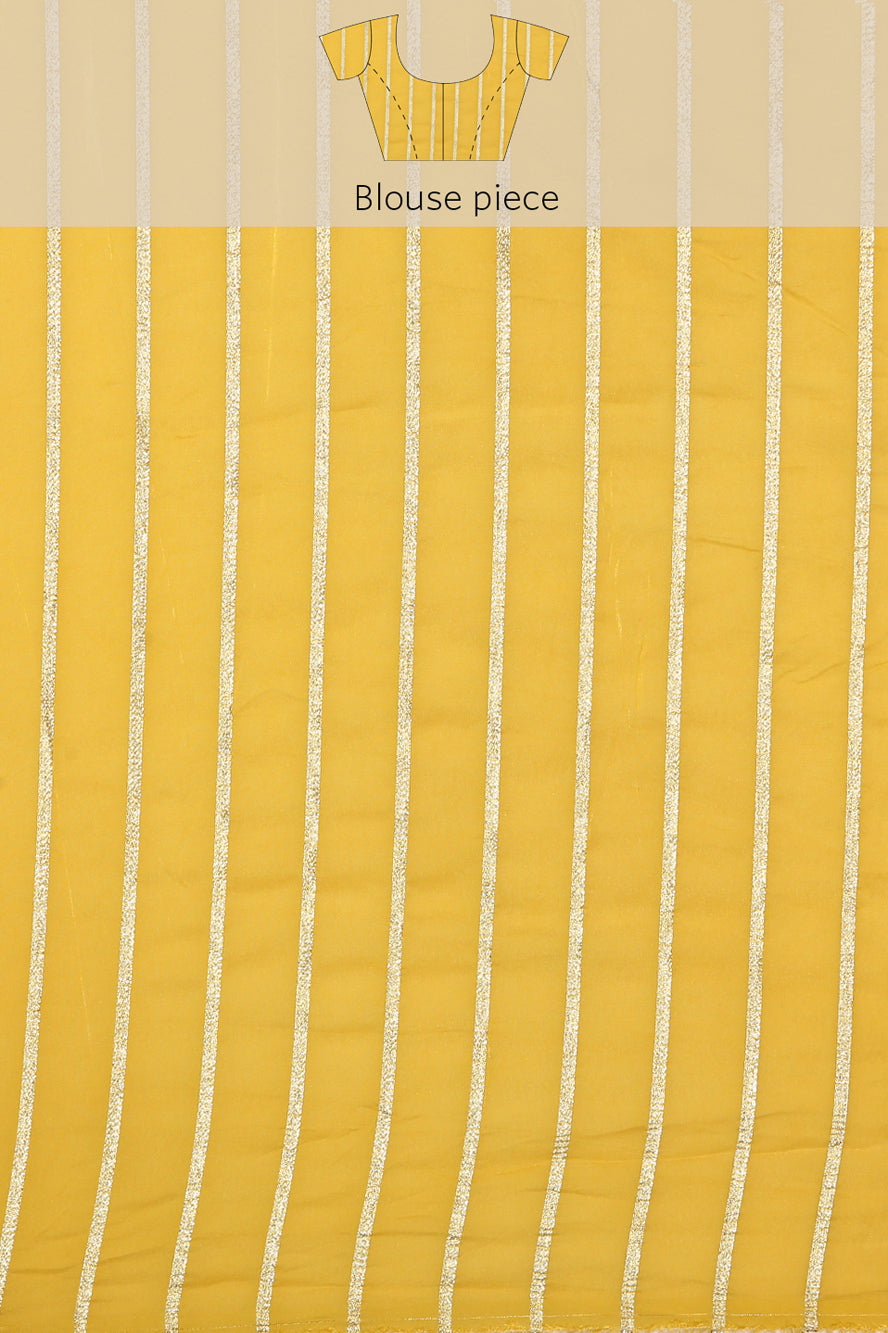Experience the rich sheen of Gajji silk. This saree glows in a solid yellow, adorned with intricate all-over thread work and a gold zari border. It’s a flawless blend of traditional texture and modern silhouette.