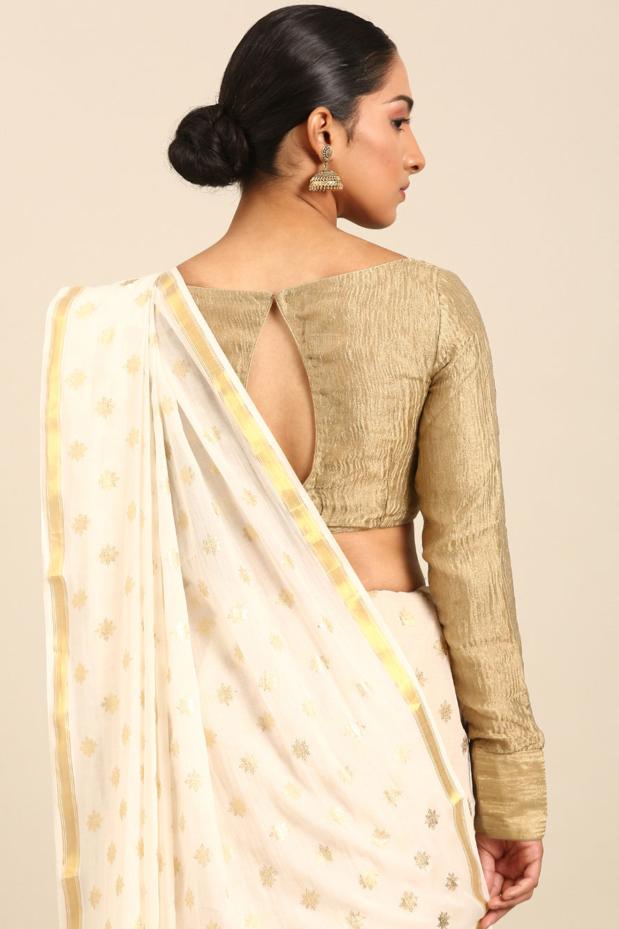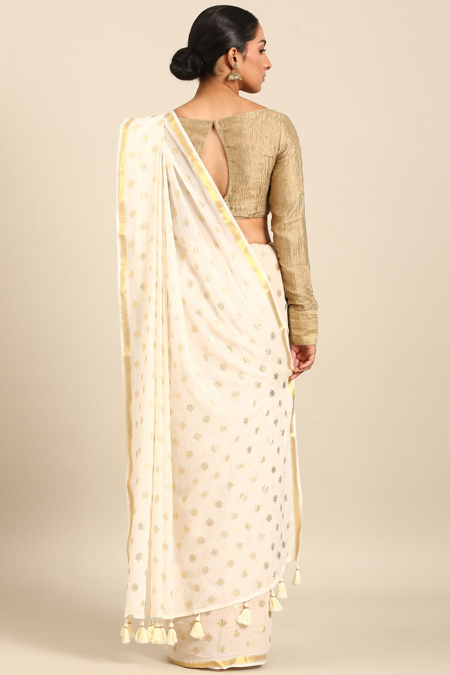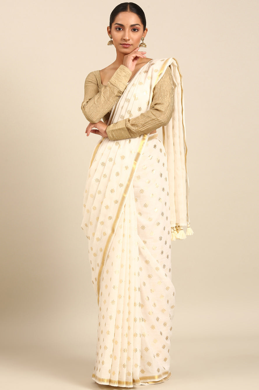 Infuse glamour into a classic pattern. The polka dots here are rendered in a luxurious gold against white, finished with gold zari borders for a look that is irresistibly opulent and modern.