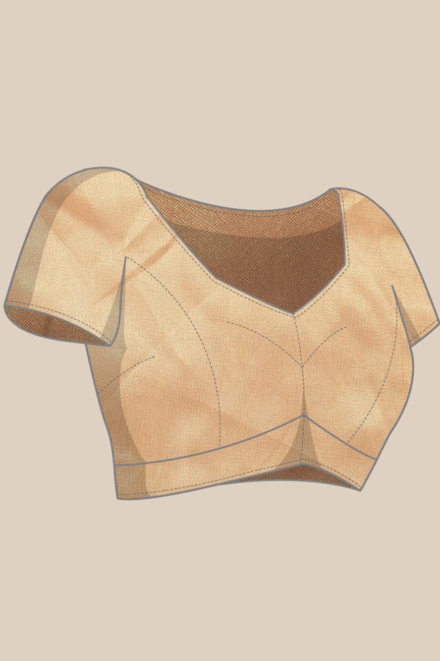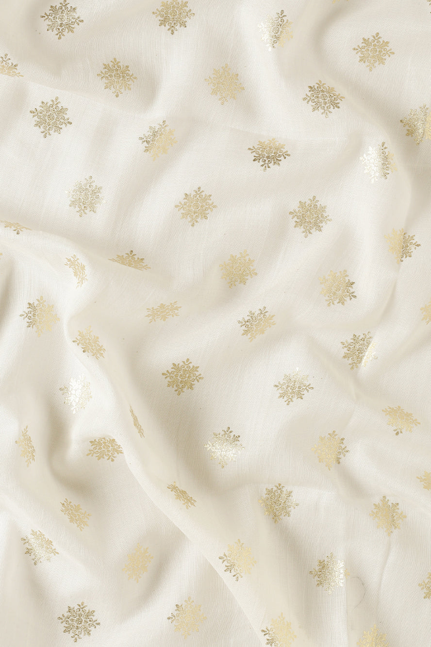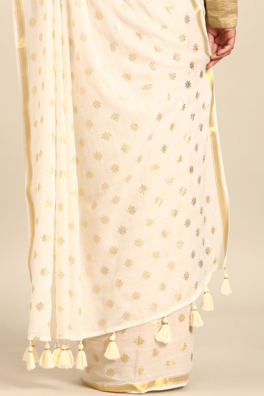 Infuse glamour into a classic pattern. The polka dots here are rendered in a luxurious gold against white, finished with gold zari borders for a look that is irresistibly opulent and modern.