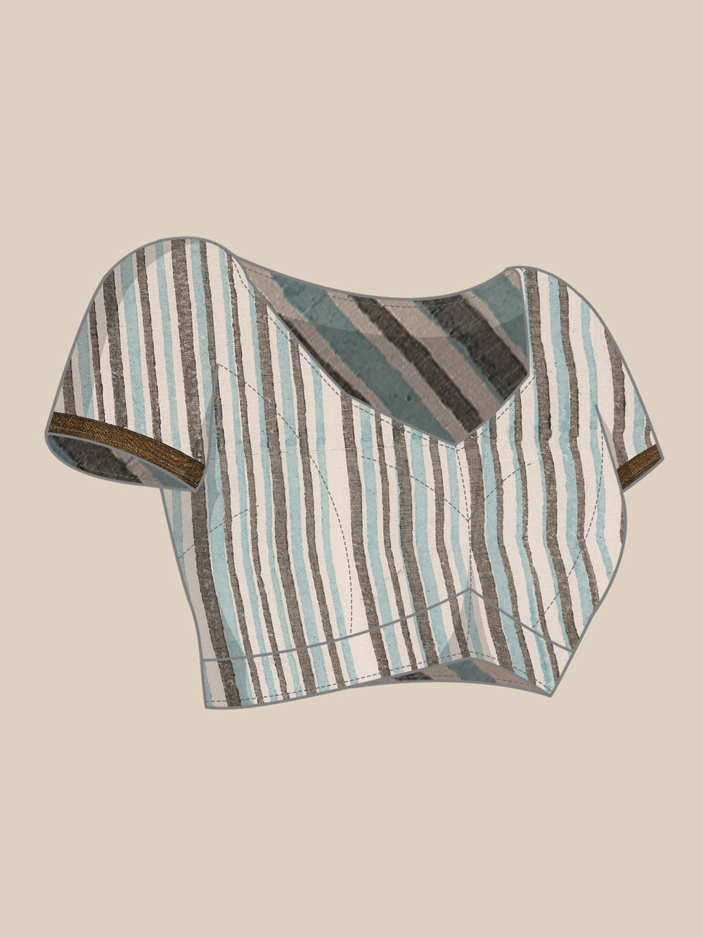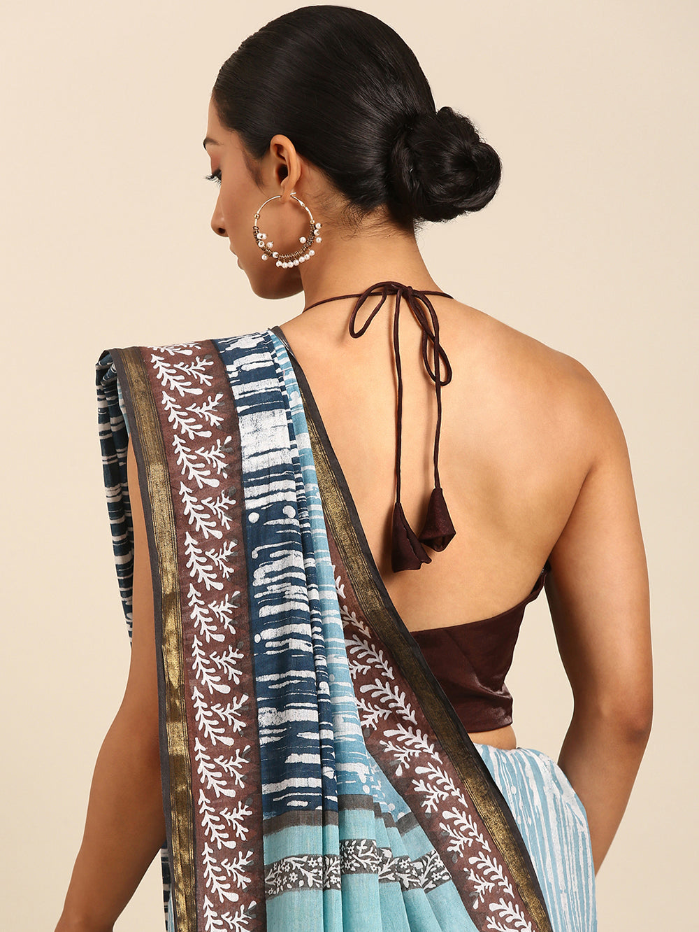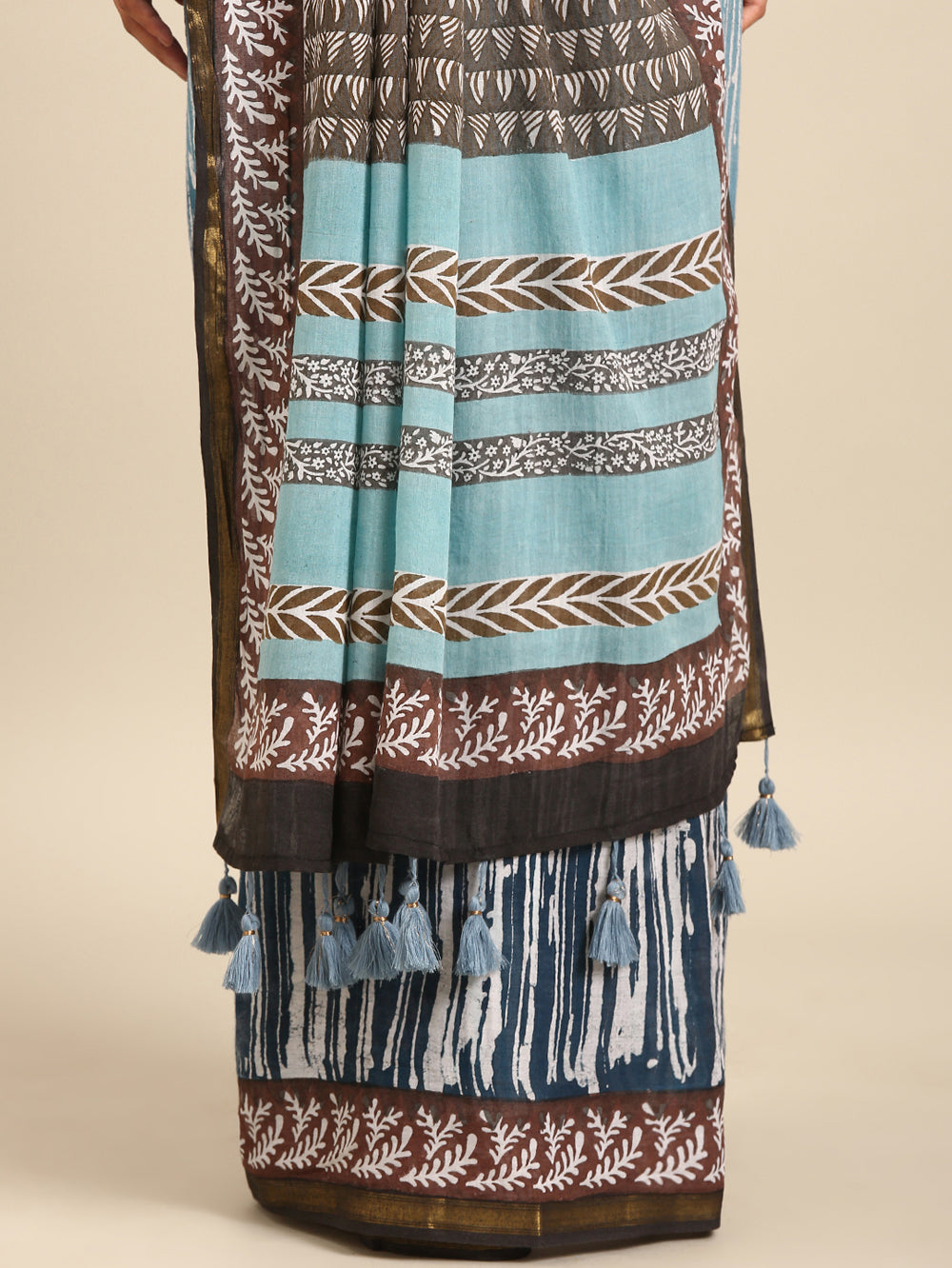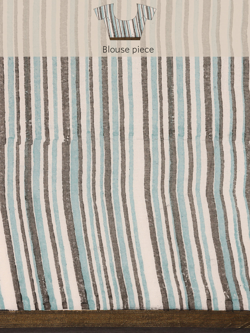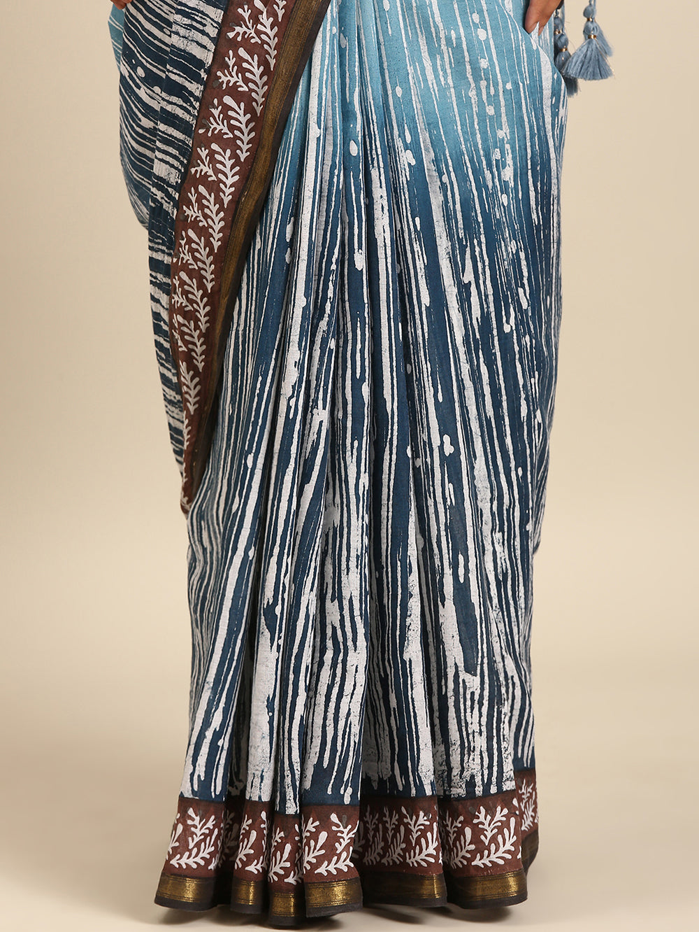 Capture the sophisticated tones of a twilight sky. This saree blends light grey-blue and brown in an all-over print, beautifully complemented by bhoti detailing and a rich gold zari border for a serene yet elegant aesthetic.
