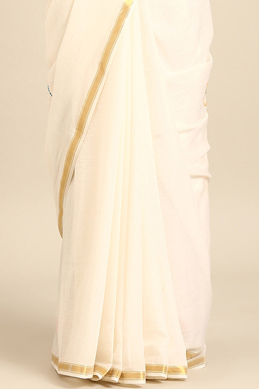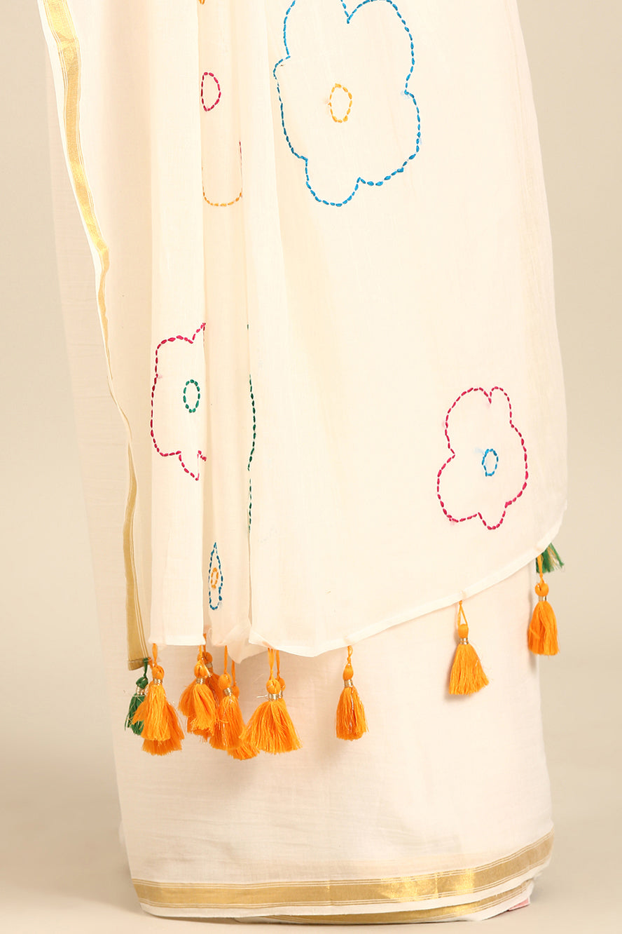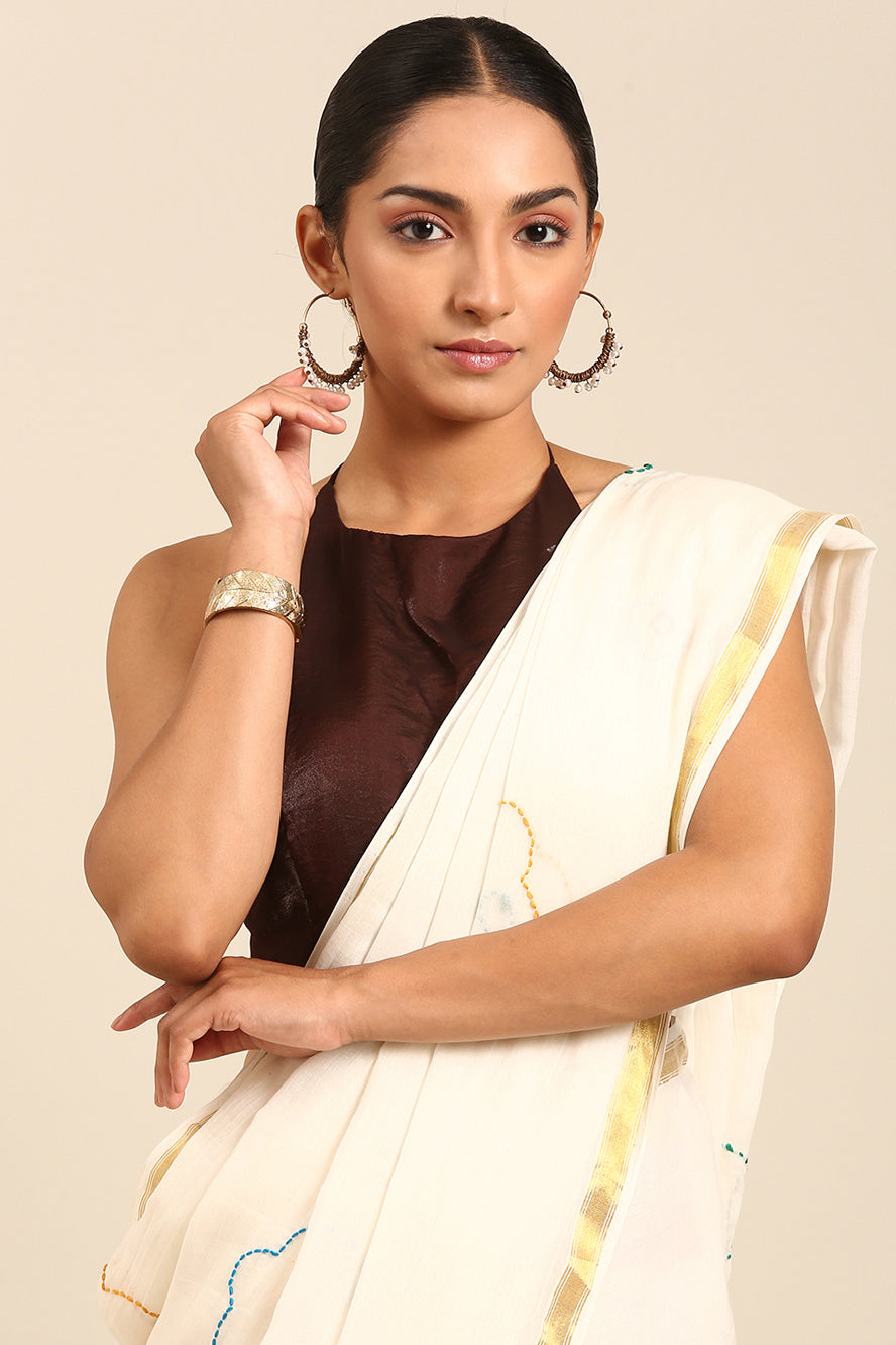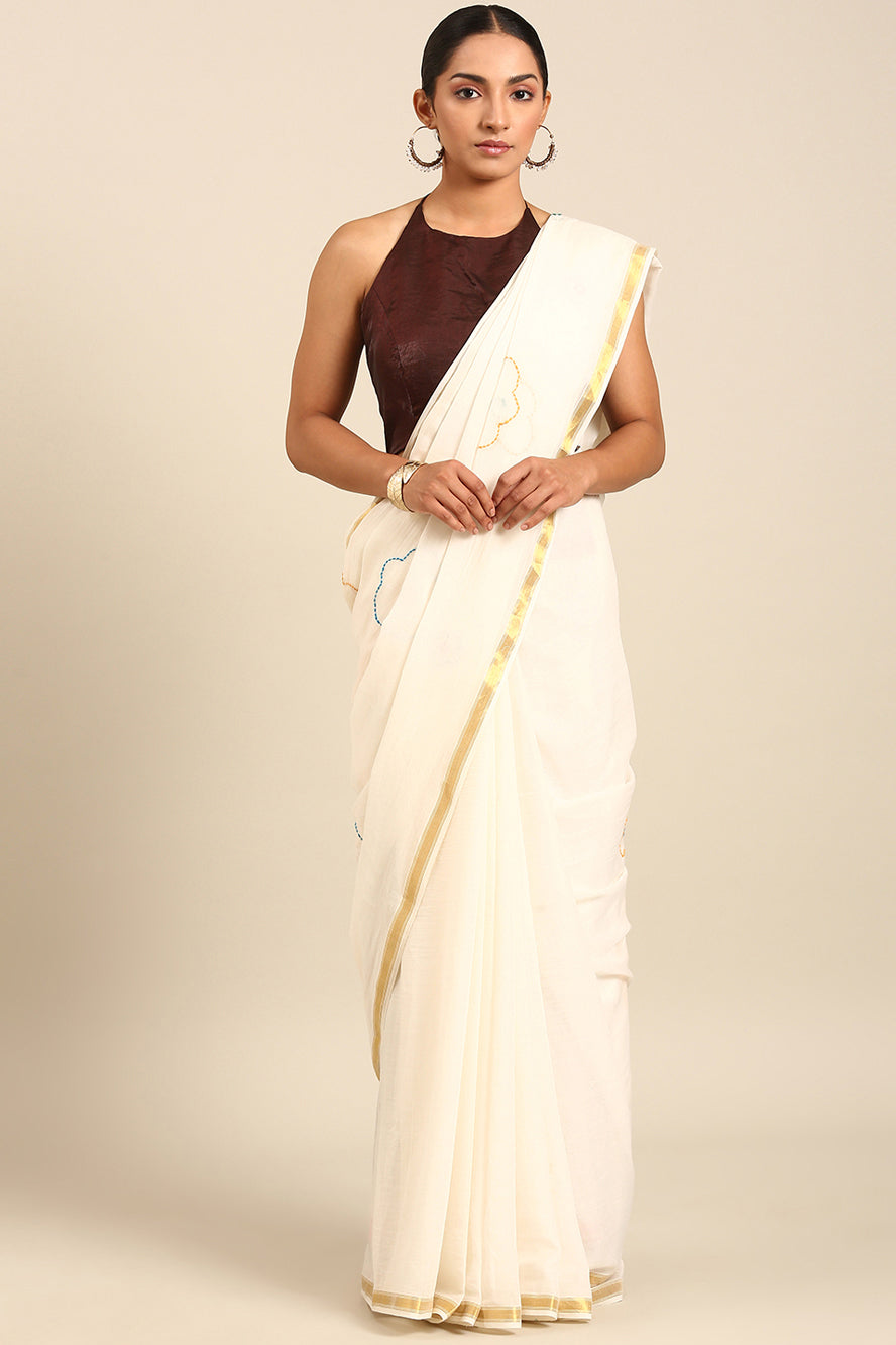 Minimalist elegance redefined. Delicate thread work adorns this pristine white saree, creating subtle texture and depth. The gold zari border and bhoti detail add a touch of refined sparkle to this clean aesthetic.