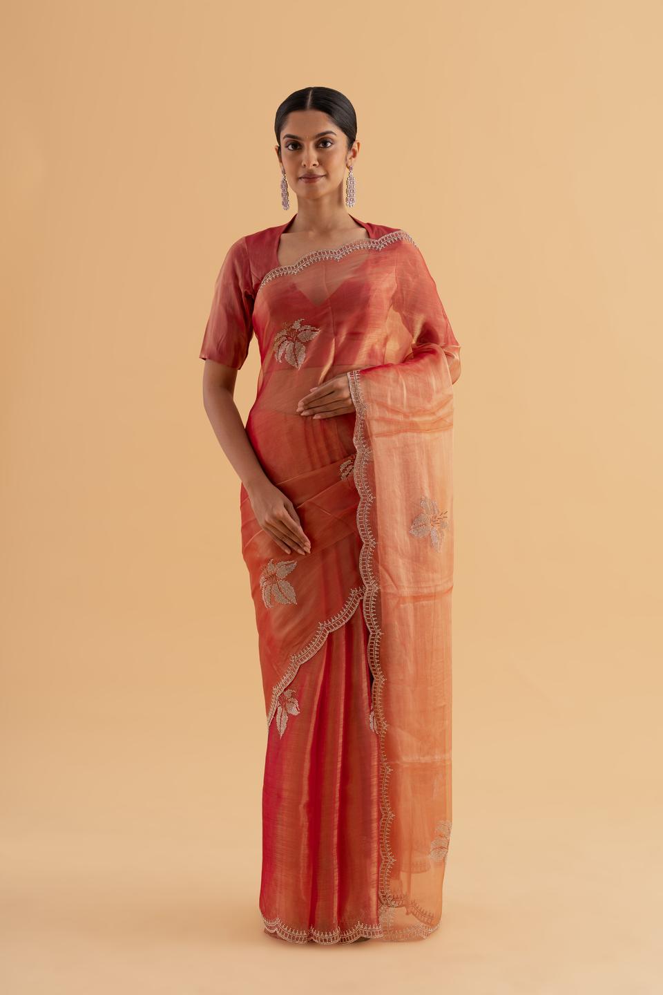 This Deep Orange-Red saree in lightweight semi organza exudes timeless charm with a modern shimmer. Hand-embellished stone work sparkles delicately across the sheer fabric, creating a look that’s equal parts graceful and glamorous.