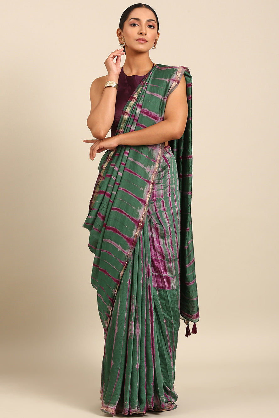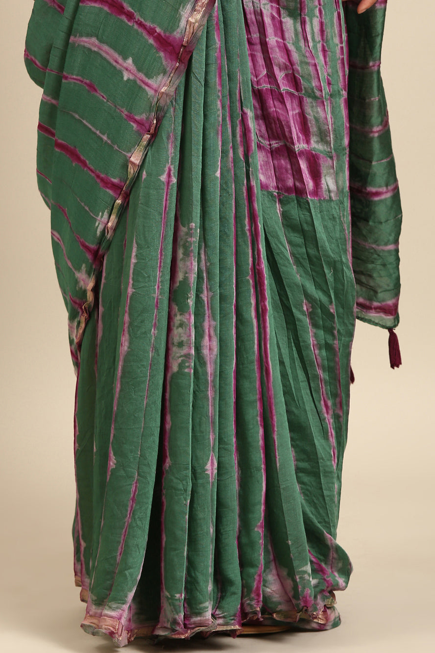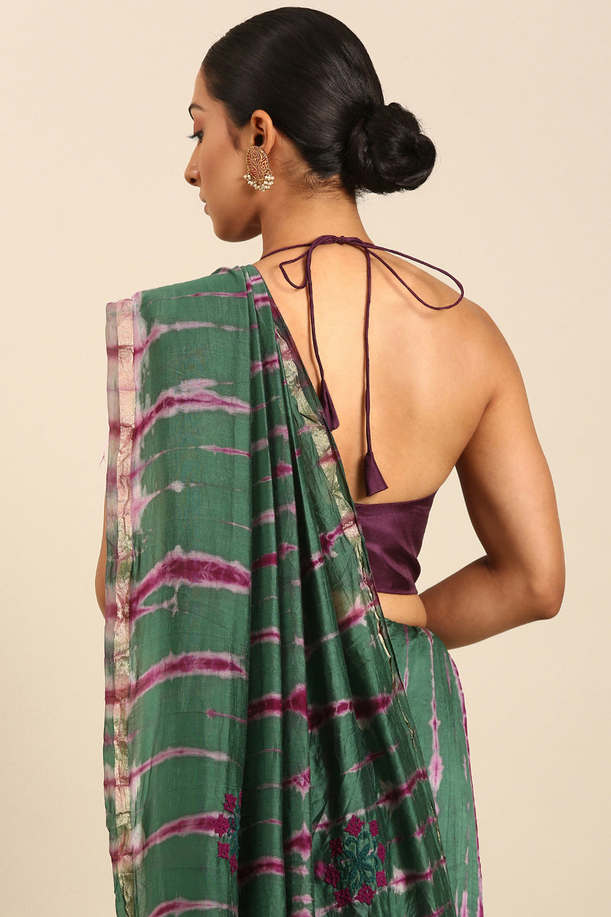Weave a spell of sophistication. This Chanderi cotton saree features an enigmatic abstract print in jewel-toned green and purple, accented by a gold zari border. The kutchi work adds a unique textural dimension.