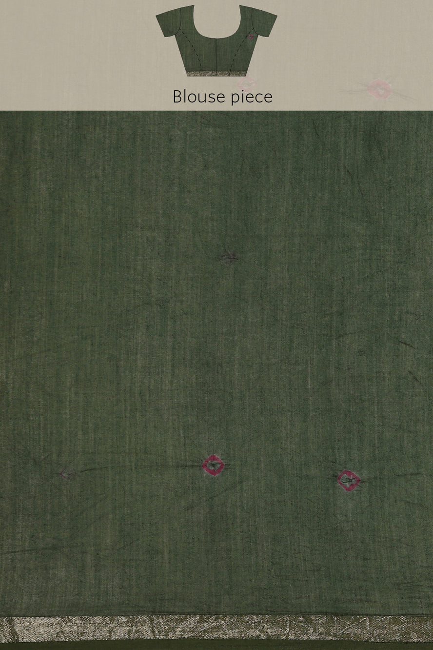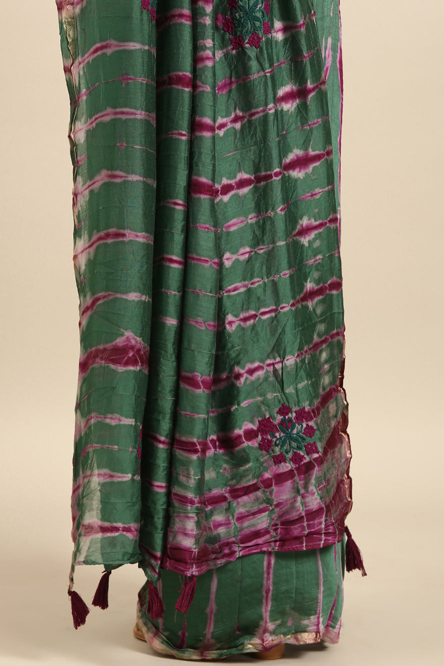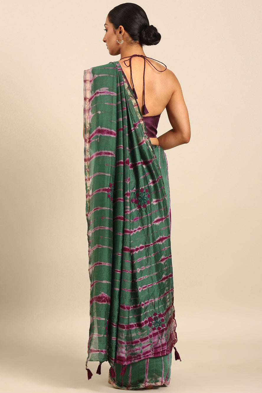 Weave a spell of sophistication. This Chanderi cotton saree features an enigmatic abstract print in jewel-toned green and purple, accented by a gold zari border. The kutchi work adds a unique textural dimension.
