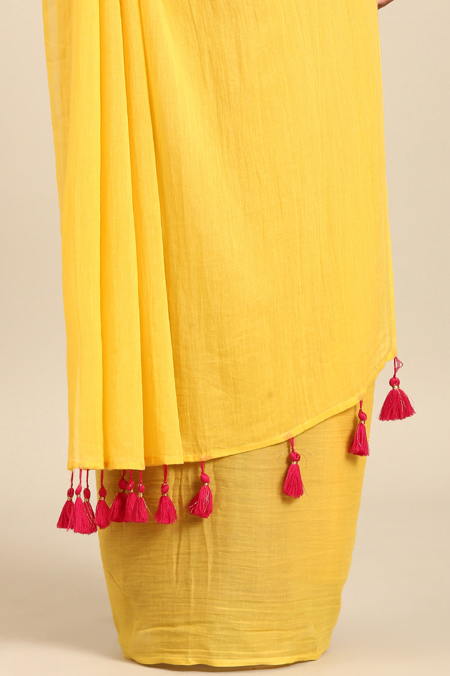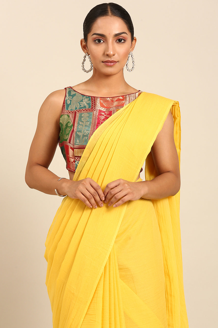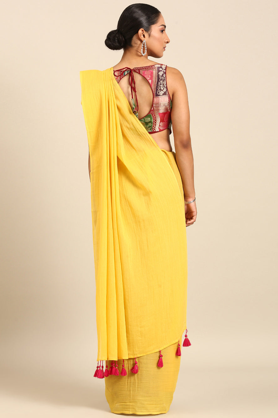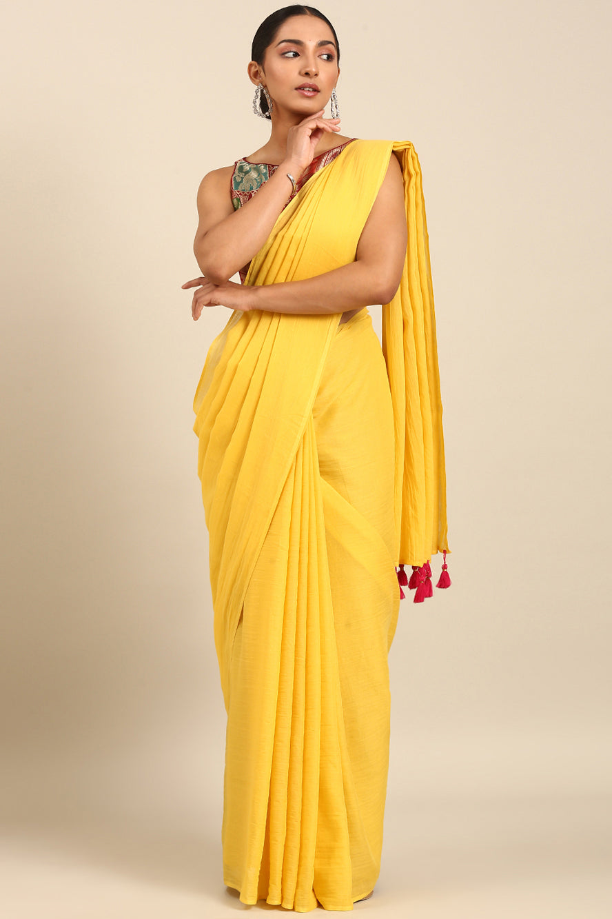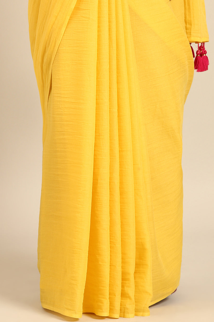 Radiate pure joy. This solid yellow saree makes a vibrant, sunny statement on its own. The simple bhoti detail on the pallu ensures the focus remains on the powerful, cheerful hue.