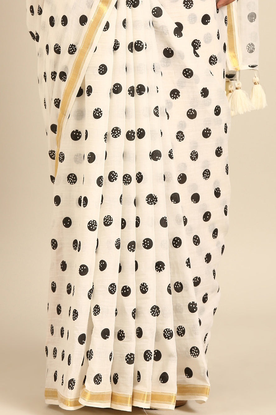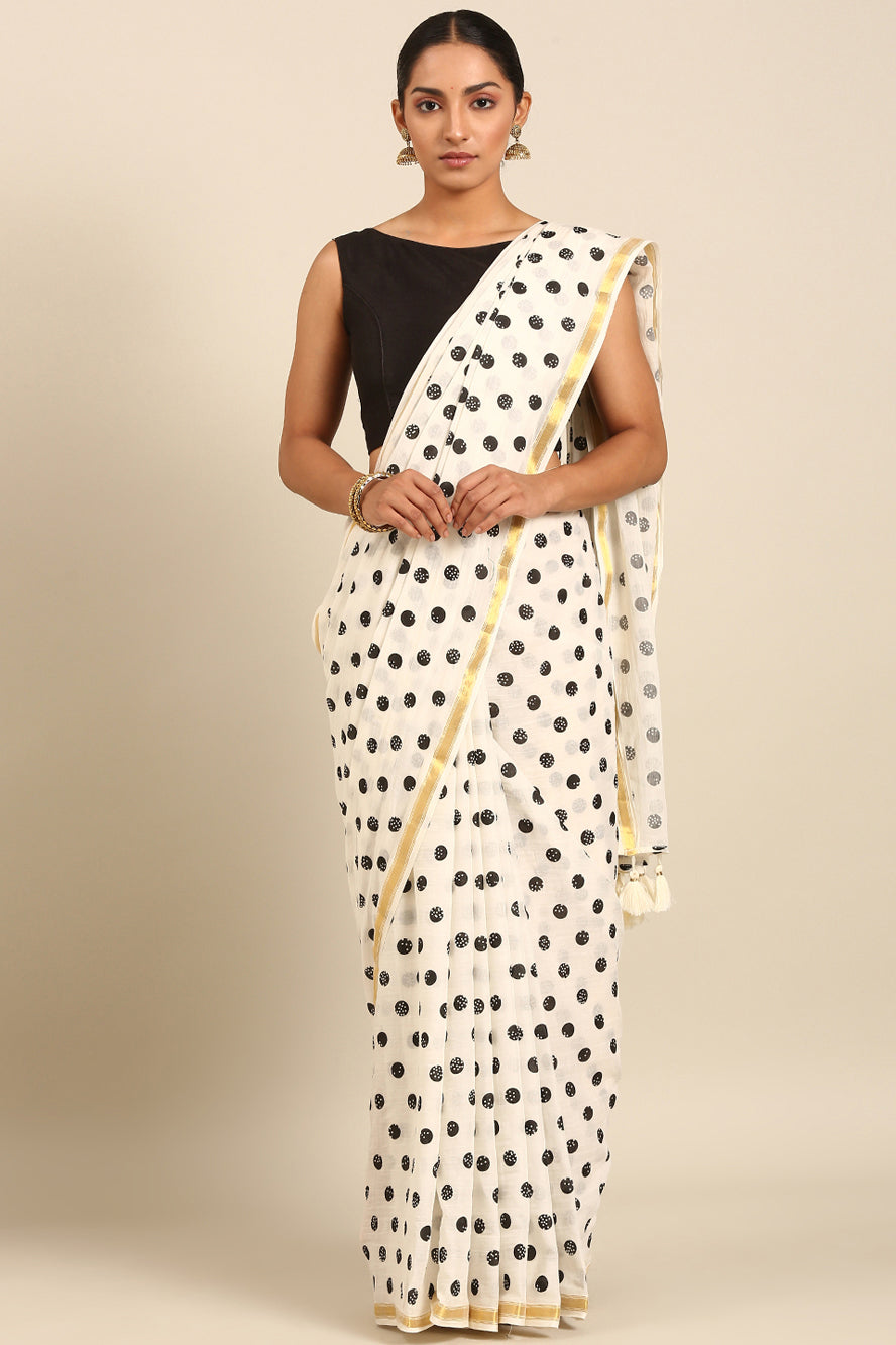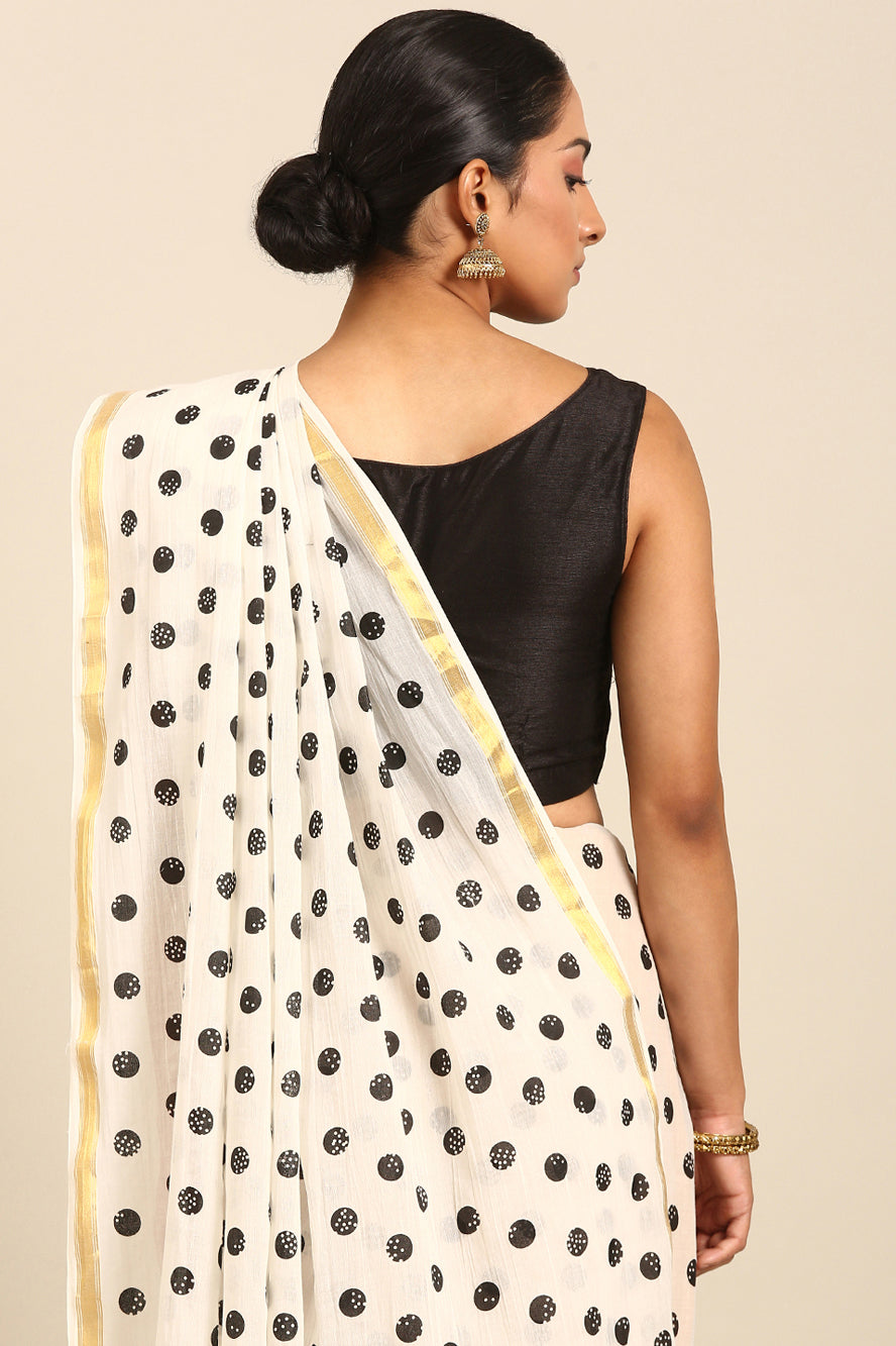 Timeless chic with a twist. This classic black and white polka dot print is elevated with bhoti detailing and contemporary gold zari borders, offering a playful yet perfectly polished look.