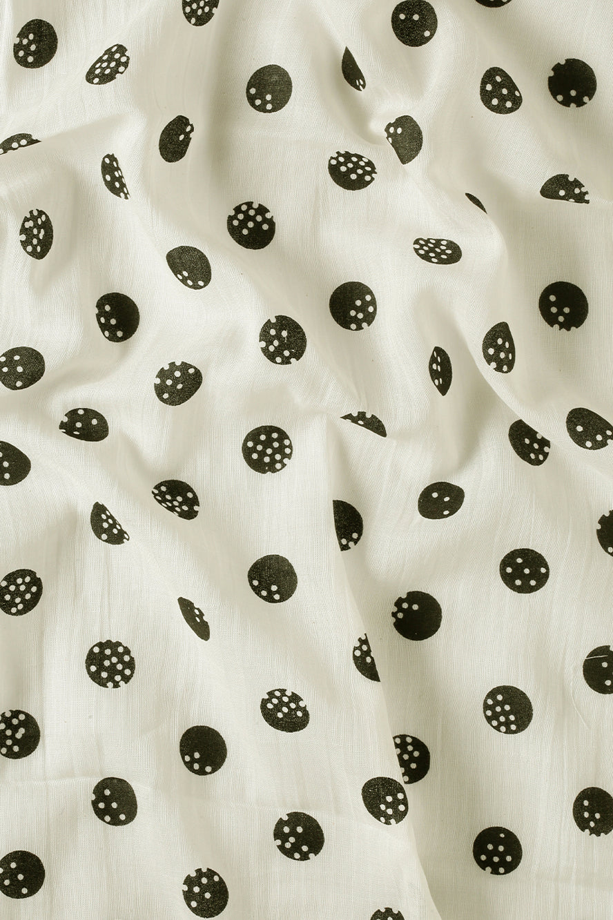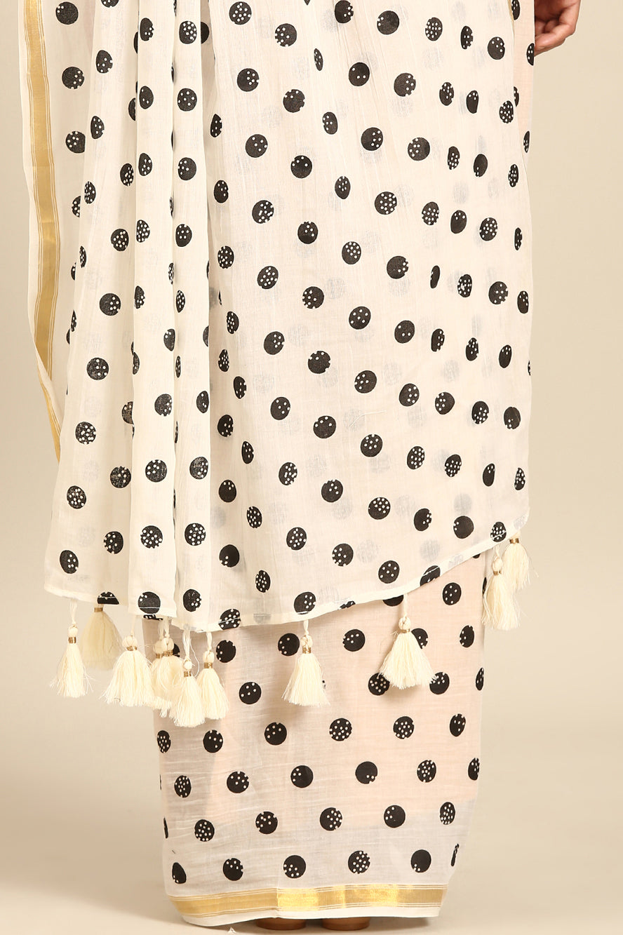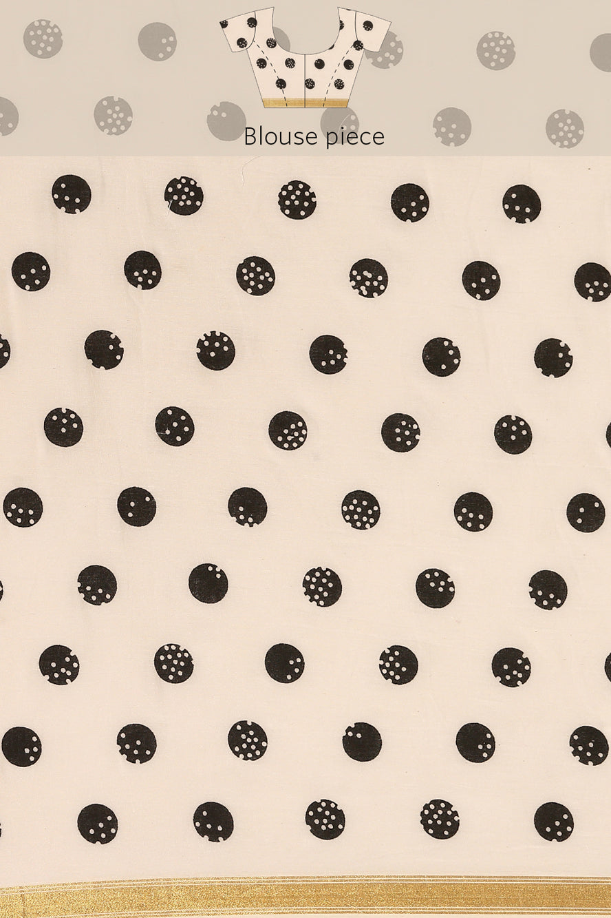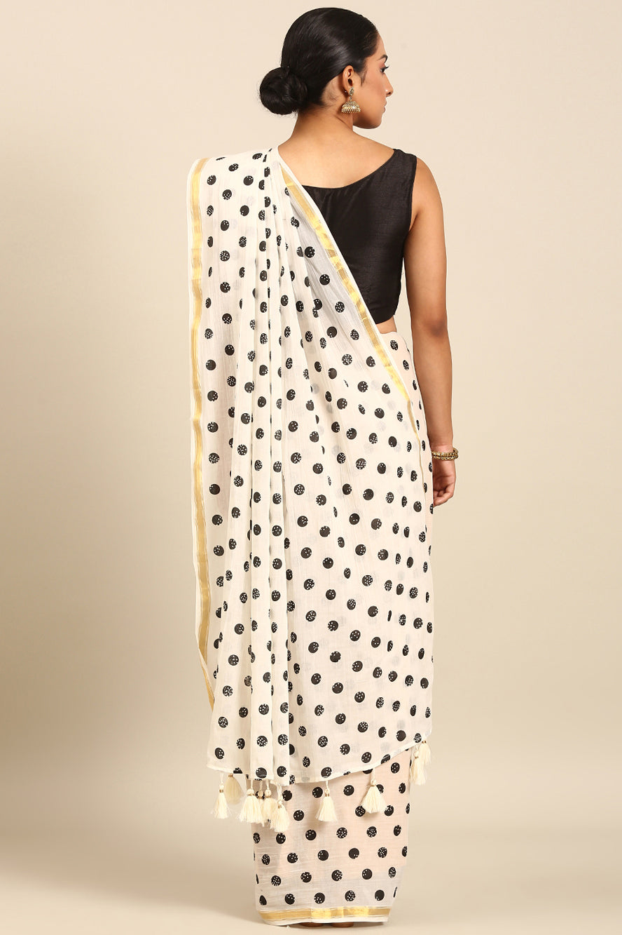 Timeless chic with a twist. This classic black and white polka dot print is elevated with bhoti detailing and contemporary gold zari borders, offering a playful yet perfectly polished look.