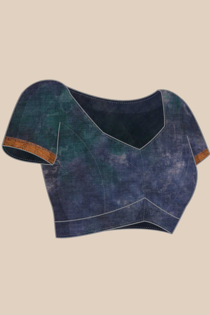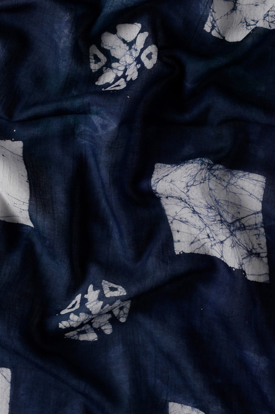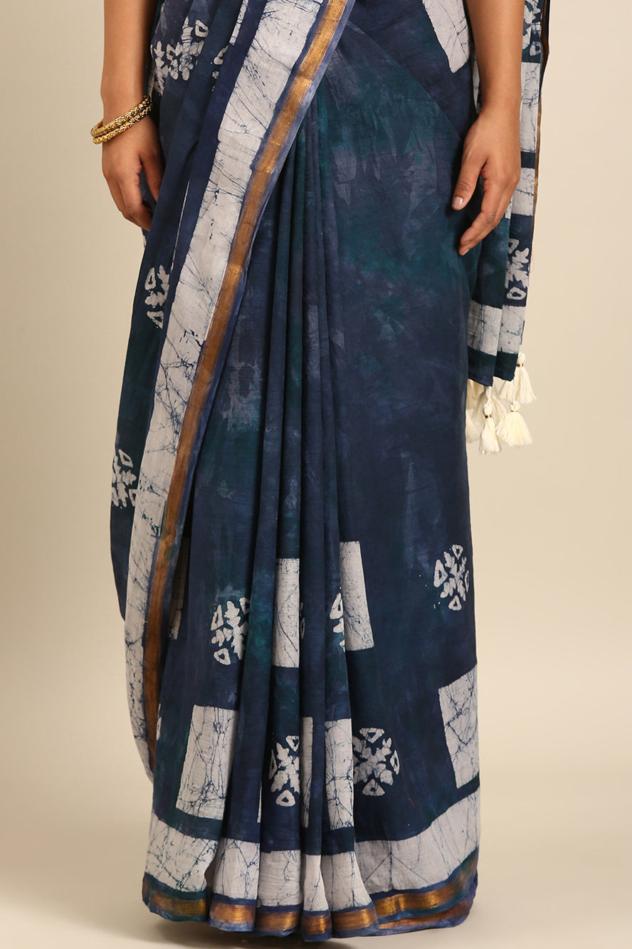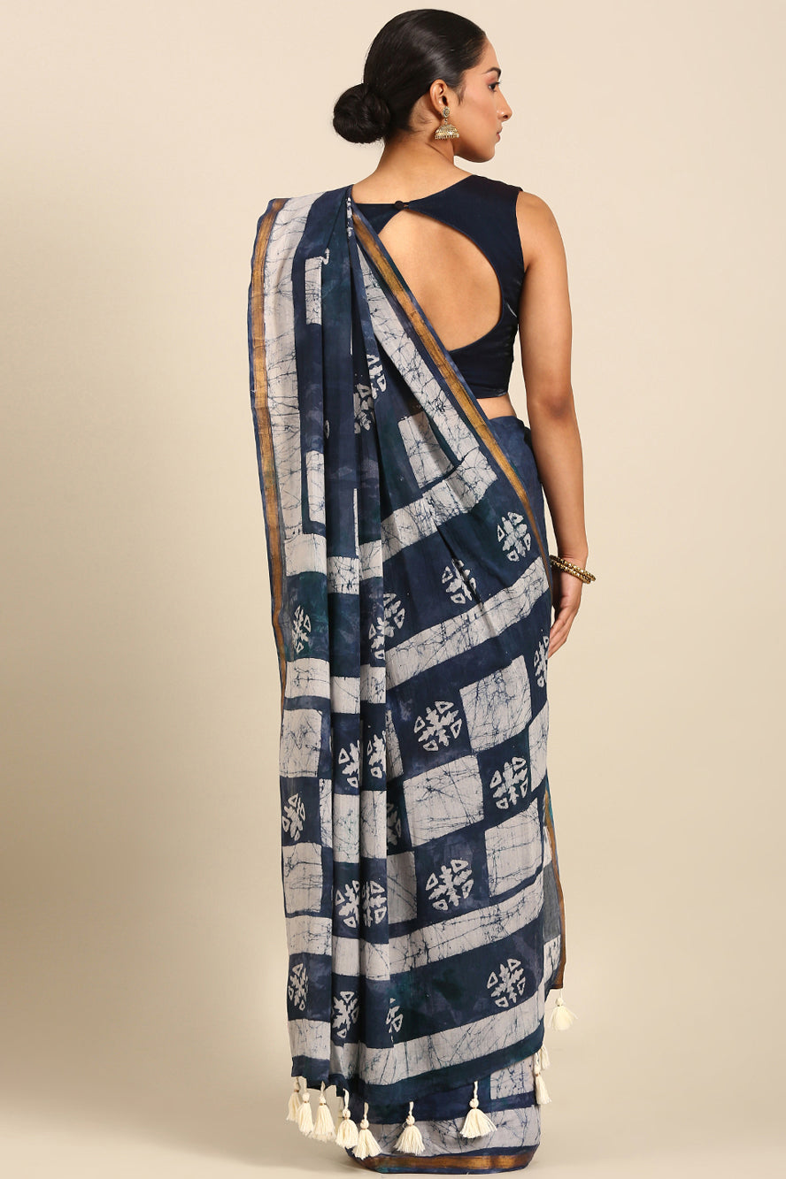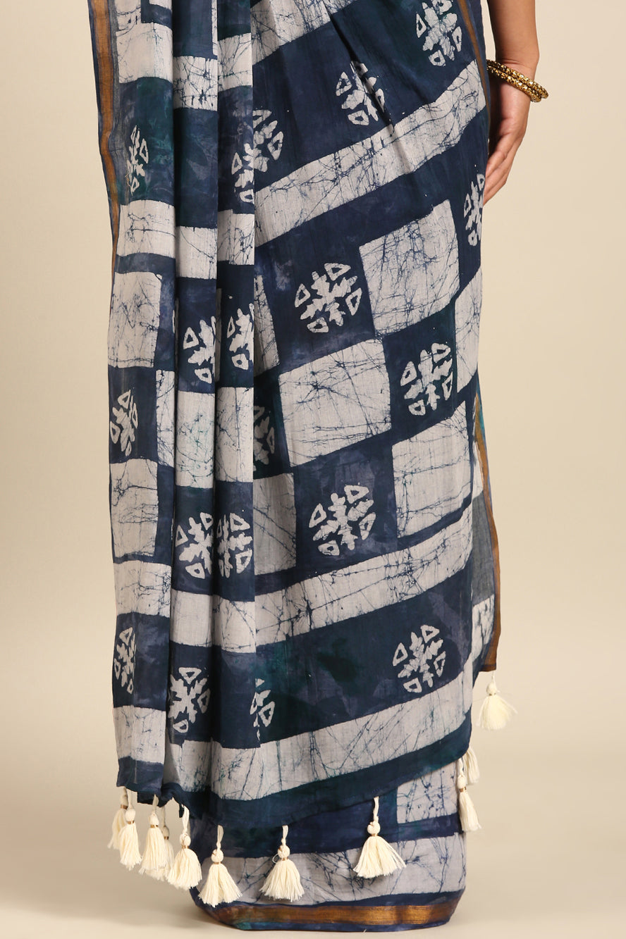 Make a crisp, sophisticated statement. This mul cotton saree features a sharp navy and white all-over print, evoking a modern maritime charm. The bhoti on the pallu provides a refined finish, making it a timeless addition to a contemporary wardrobe.