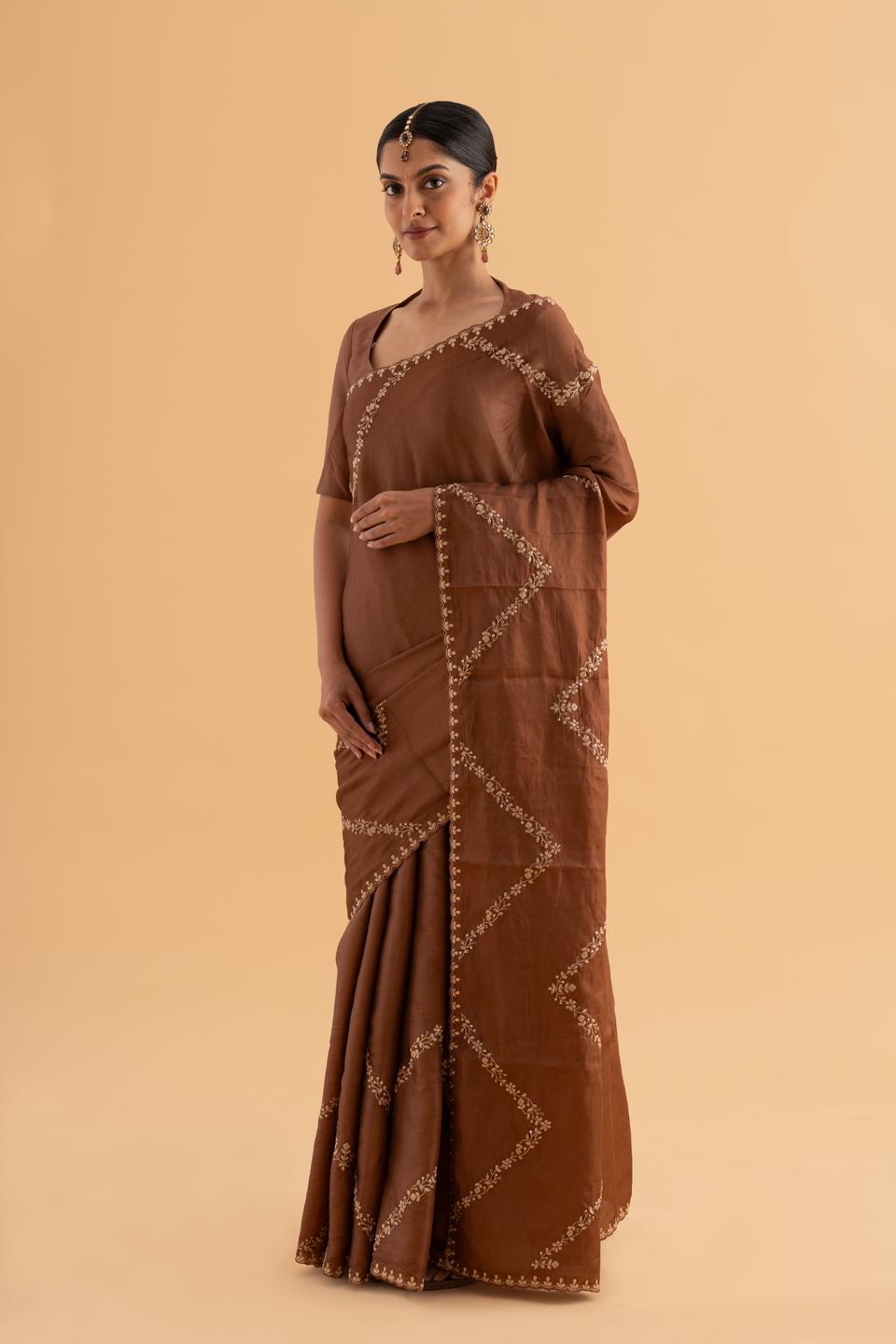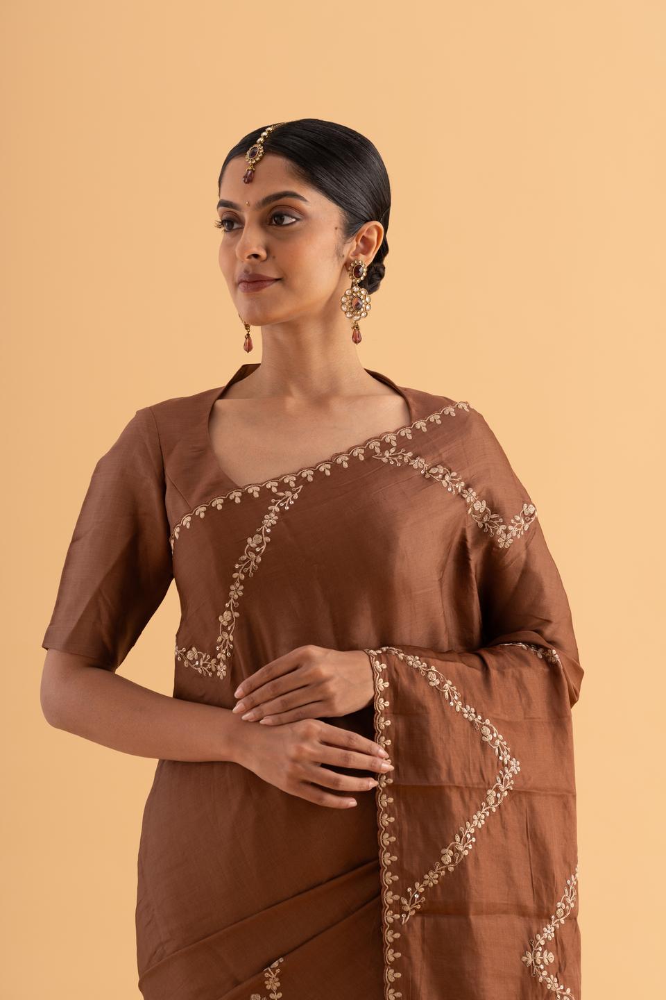 This Brown soft silk saree is a celebration of depth and texture. The luxurious feel of soft silk combined with fine thread work creates a drape that’s both regal and rooted in tradition.