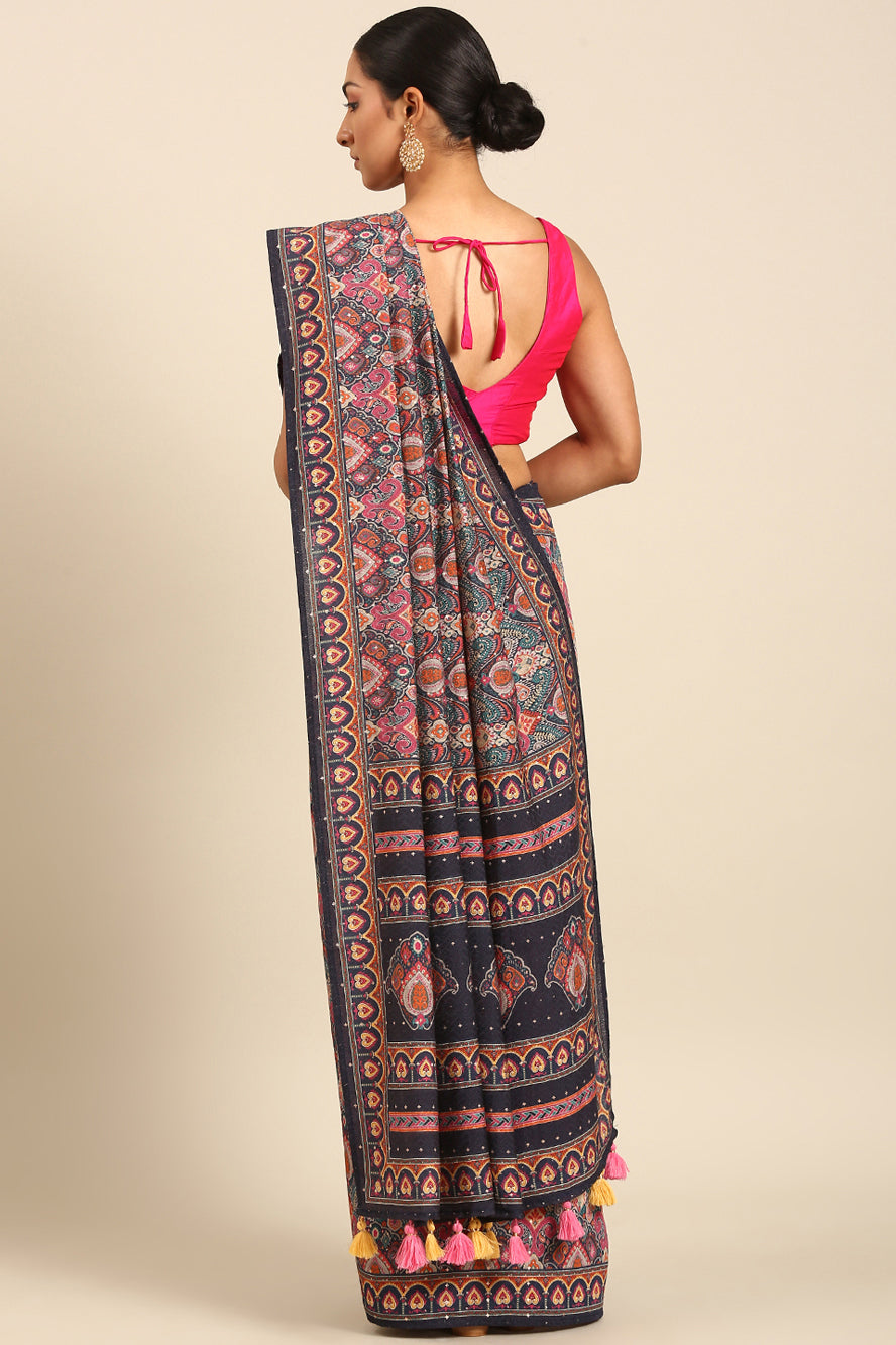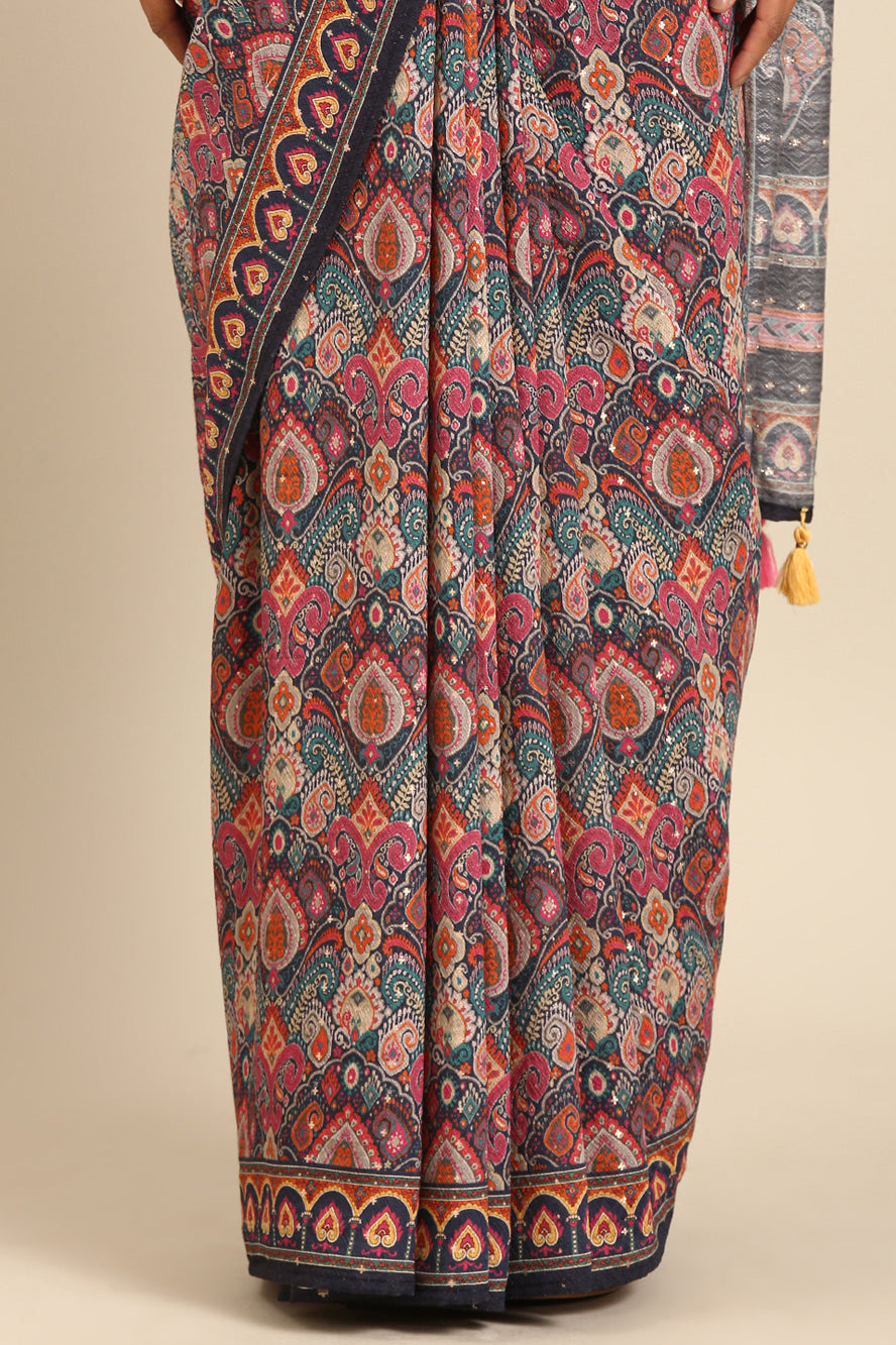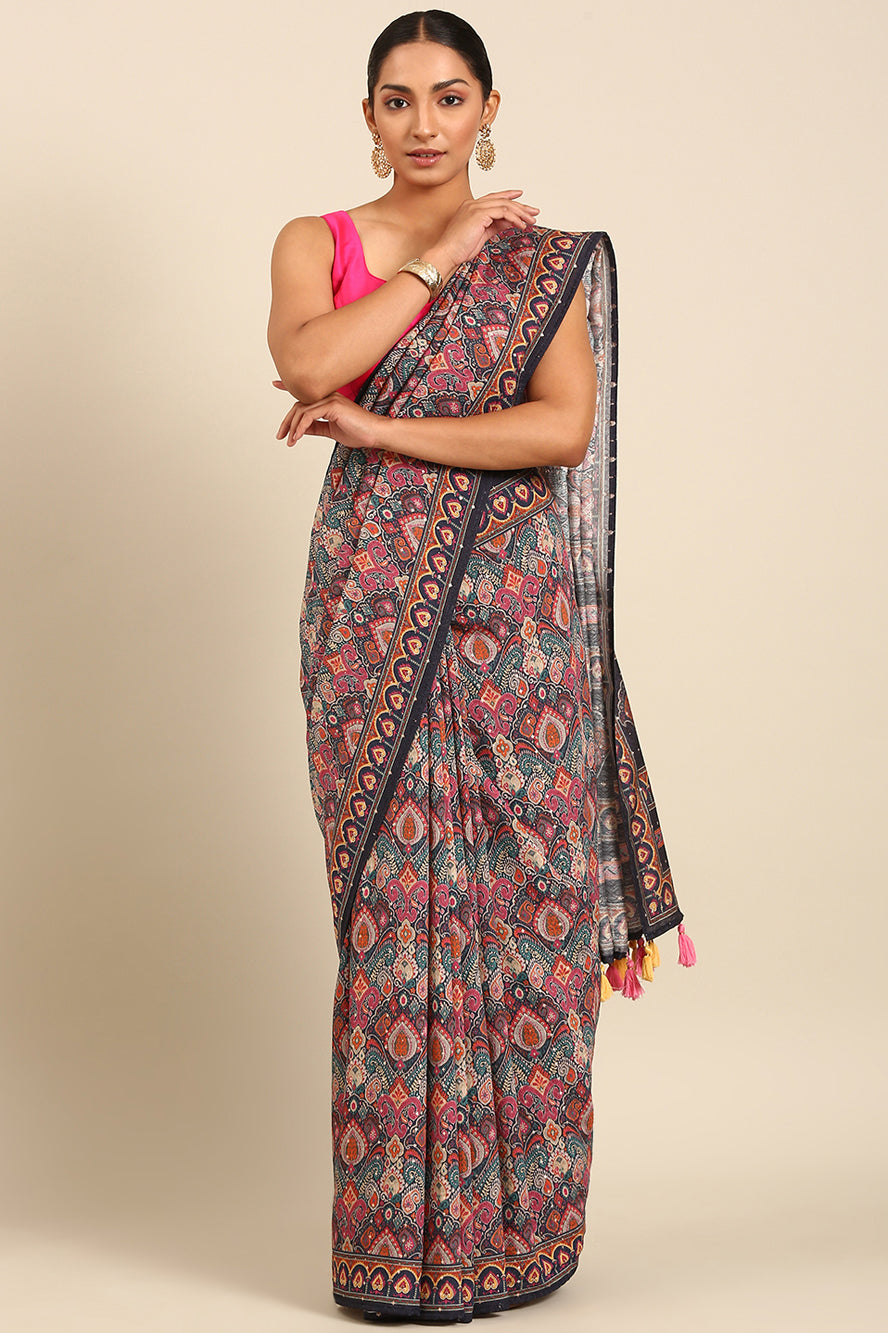 Drape yourself in the luxurious drape of modal. The Mirage saree showcases a deep, captivating paisley print in shades of blue and pink, creating a dynamic, fluid look. Its breathable fabric ensures elegance is always comfortable.