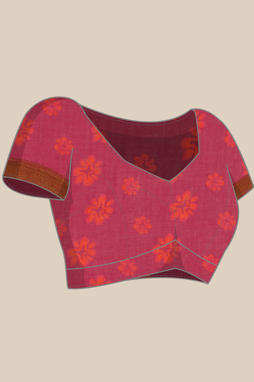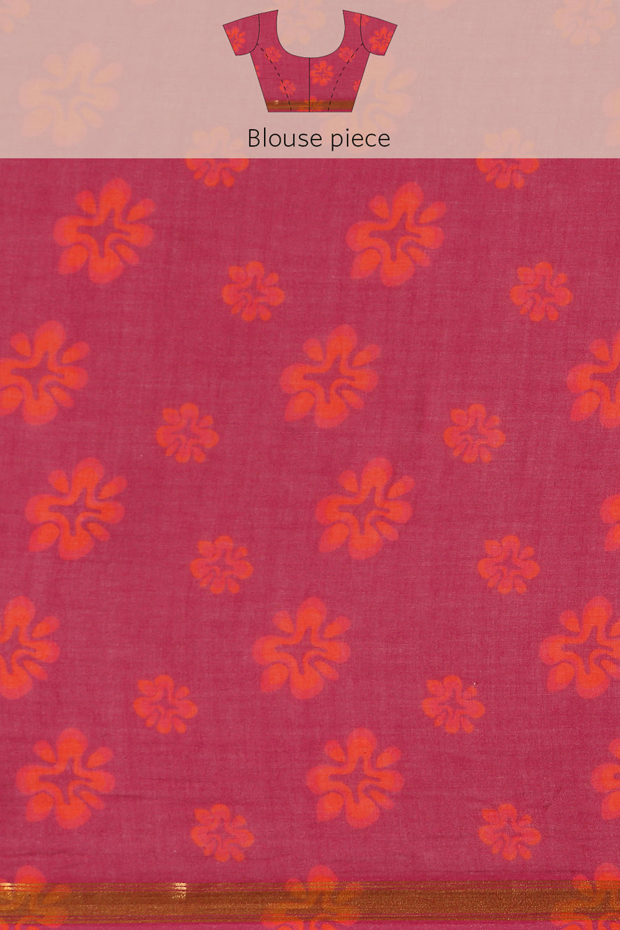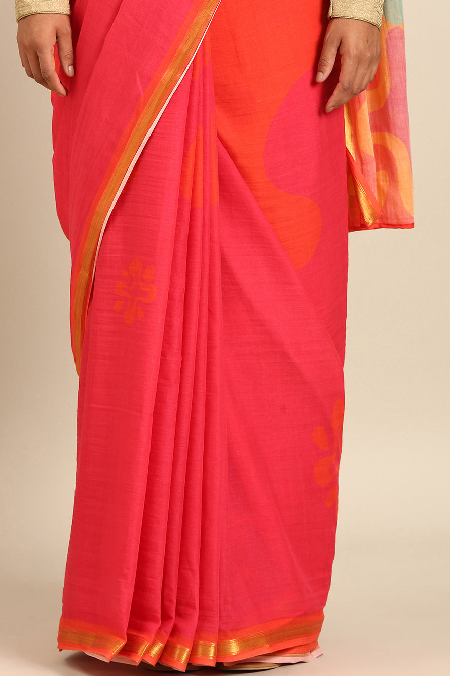Channel modern artistry with the Aura saree. Its vibrant, all-over abstract print in pink and multi-colors is perfectly framed by a sophisticated gold zari border, creating a look that is both playful and polished.
