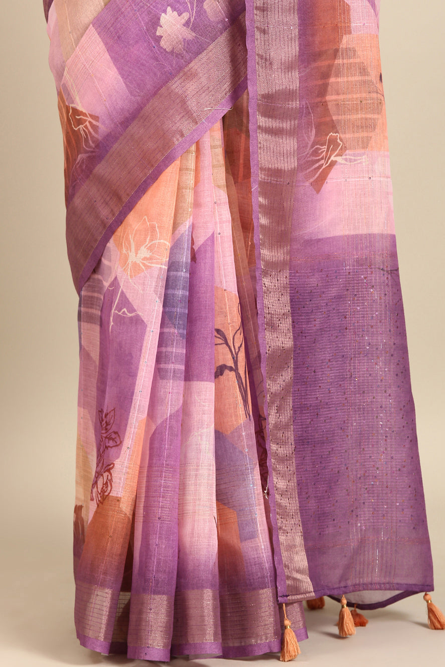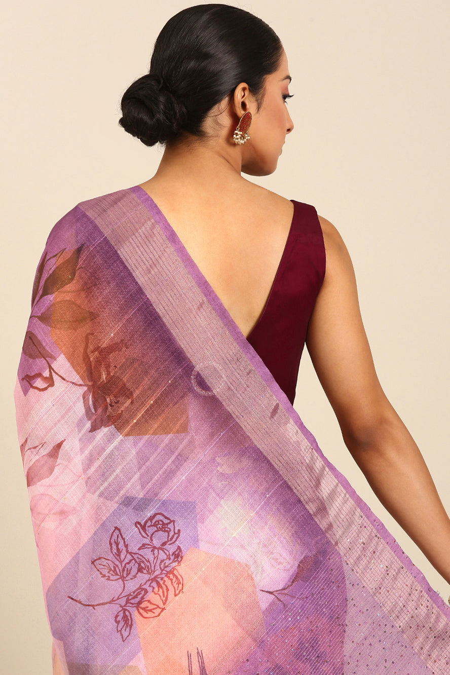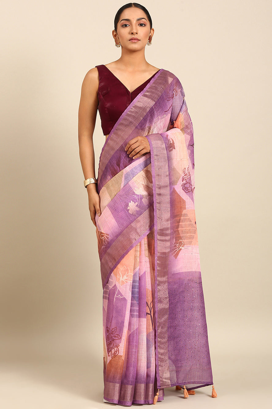 Make a statement with this bold purple and pink cotton silk saree. The fluid texture and vibrant all-over print, enhanced by a gleaming zari border, make this saree a natural pick for festive occasions, parties, or dinners. Modern, rich, and designed for unforgettable elegance.