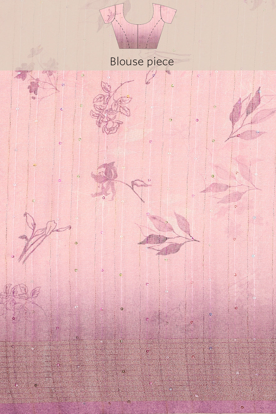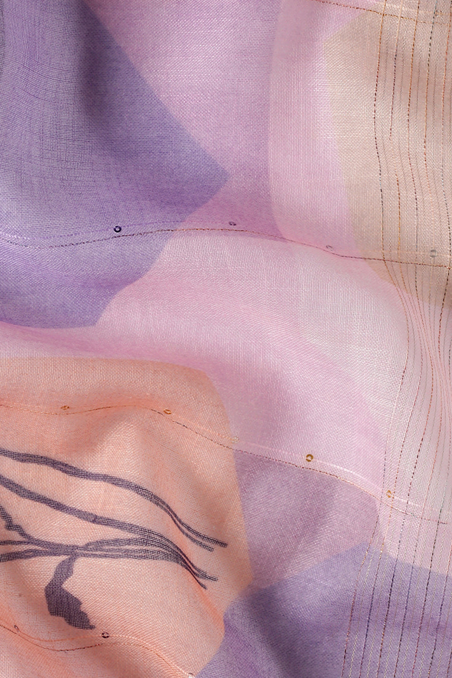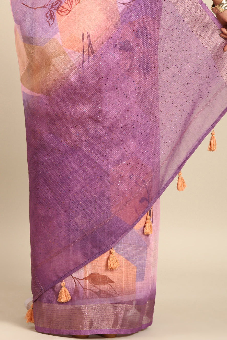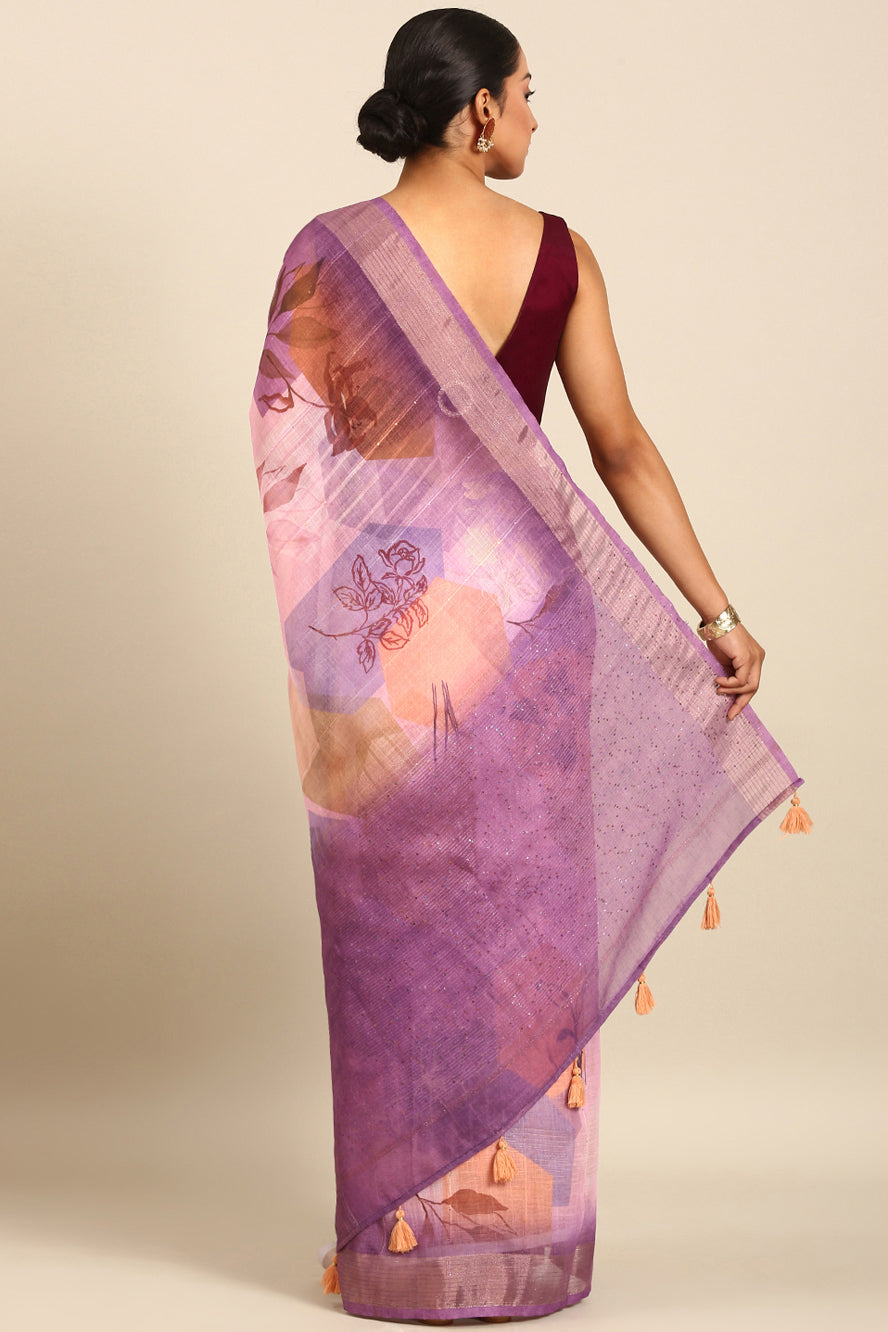 Make a statement with this bold purple and pink cotton silk saree. The fluid texture and vibrant all-over print, enhanced by a gleaming zari border, make this saree a natural pick for festive occasions, parties, or dinners. Modern, rich, and designed for unforgettable elegance.