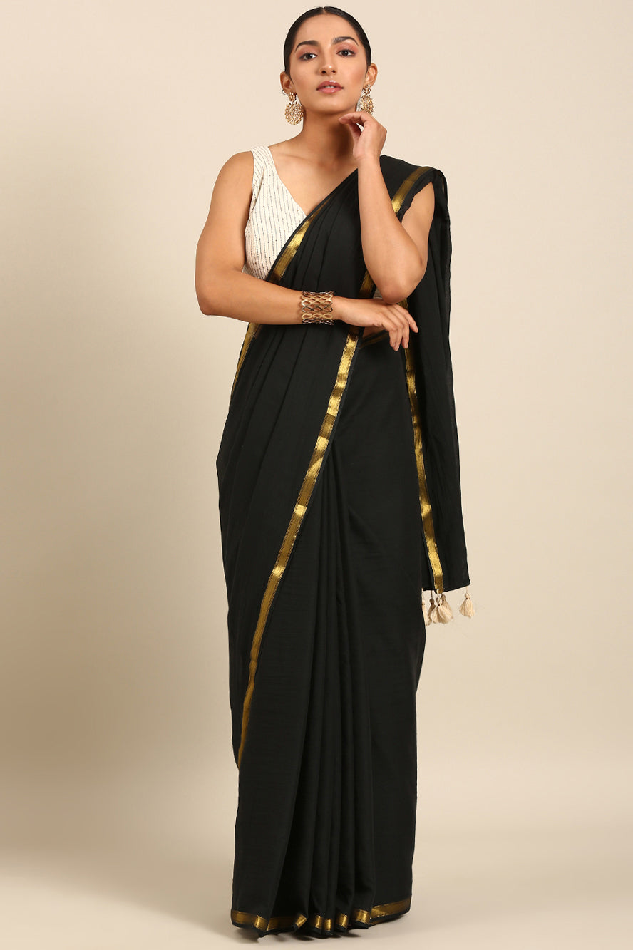 The ultimate wardrobe essential, reimagined. This solid black saree is the epitome of timeless chic. Its minimalist design, punctuated only by a bhoti pallu, offers endless styling possibilities for a modern audience.