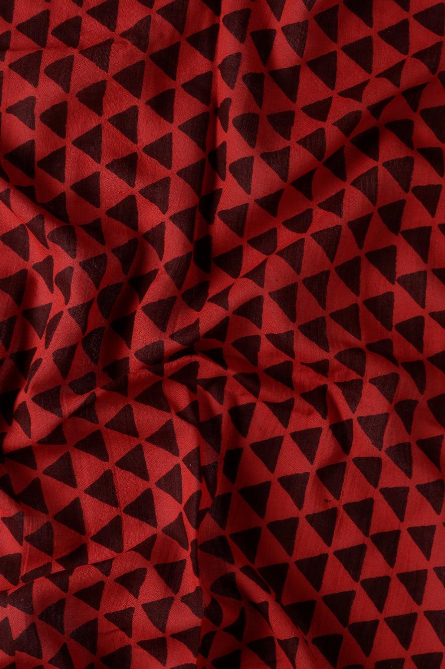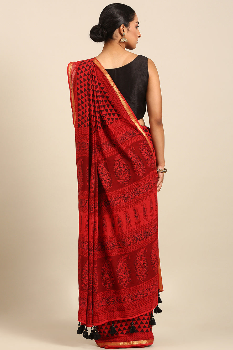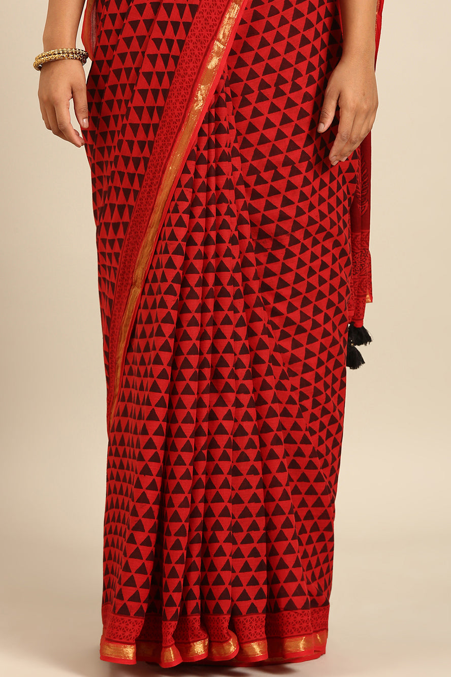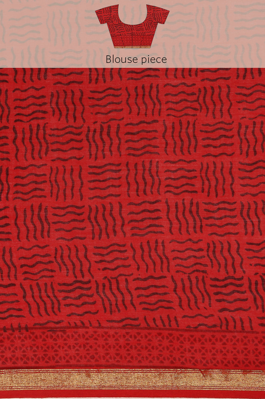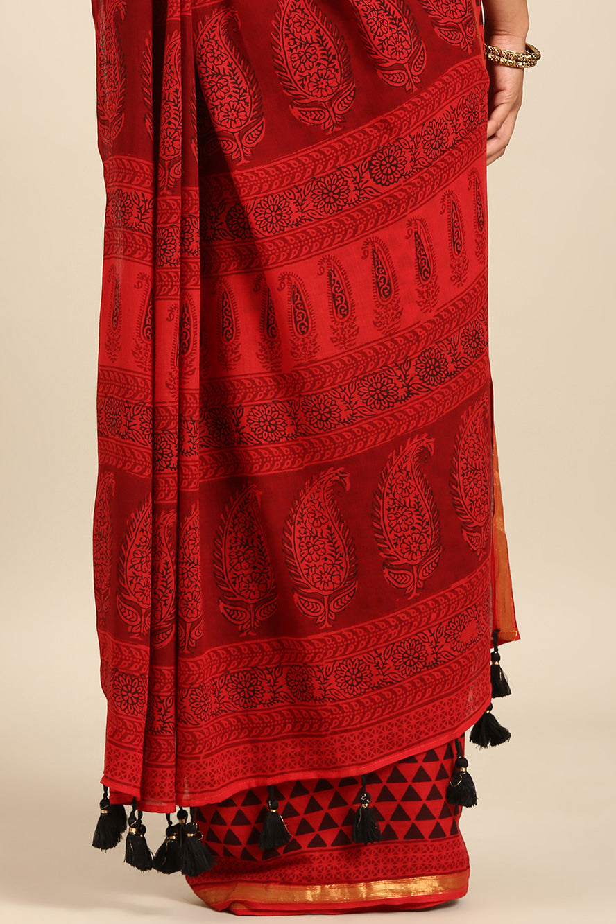 Command attention with the depth of classic red. This bold mul cotton saree features a striking all-over print contrasted with black, finished with a detailed bhoti pallu. It’s a powerful look for those who make a statement.