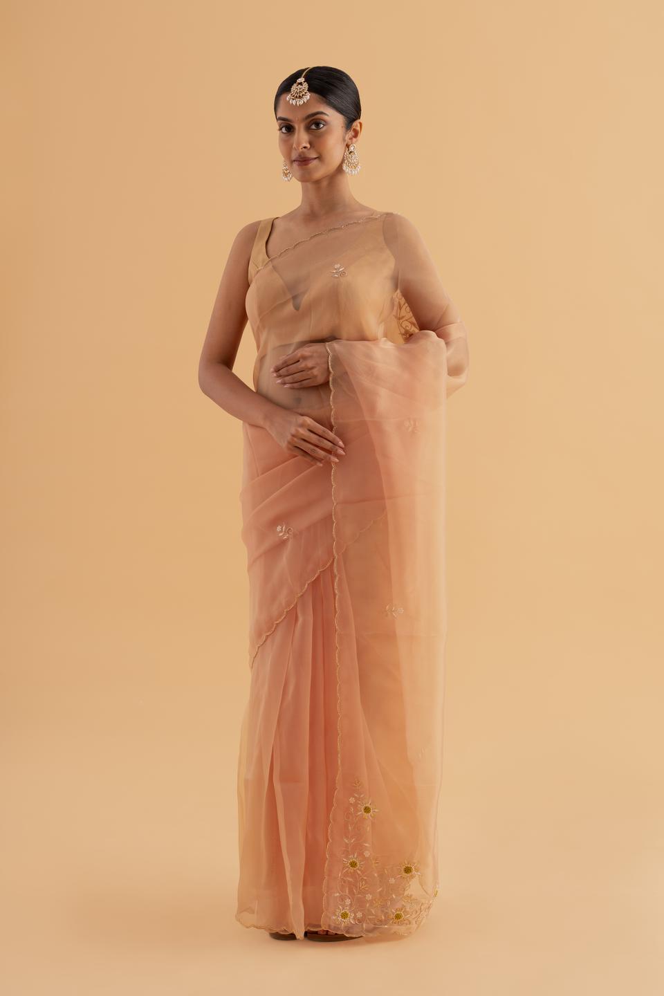 A staple must-have organza saree with delicate zari and thread work. Finished with scalloped edges, this saree provides a graceful and sophisticated choice for special occasions.