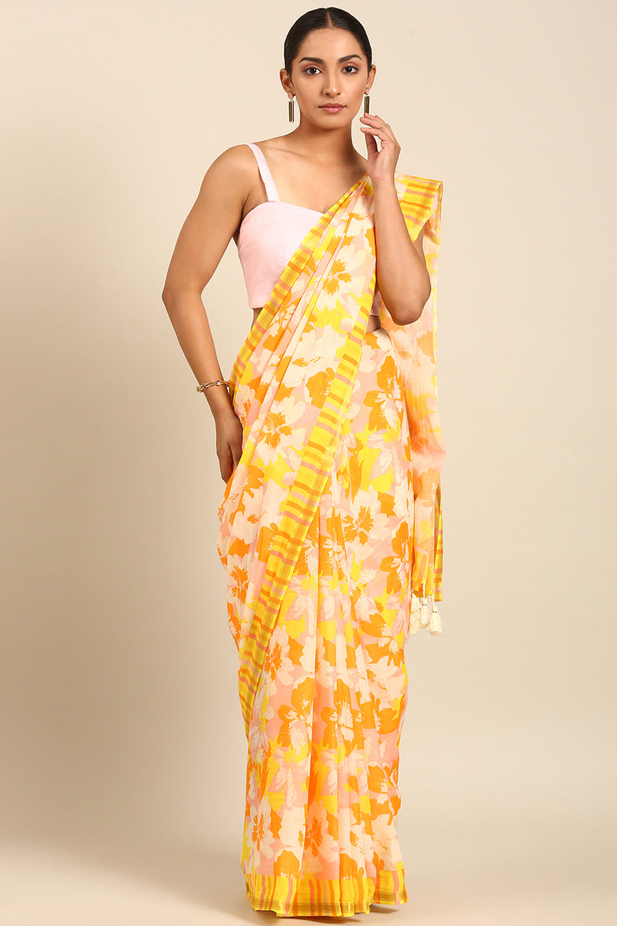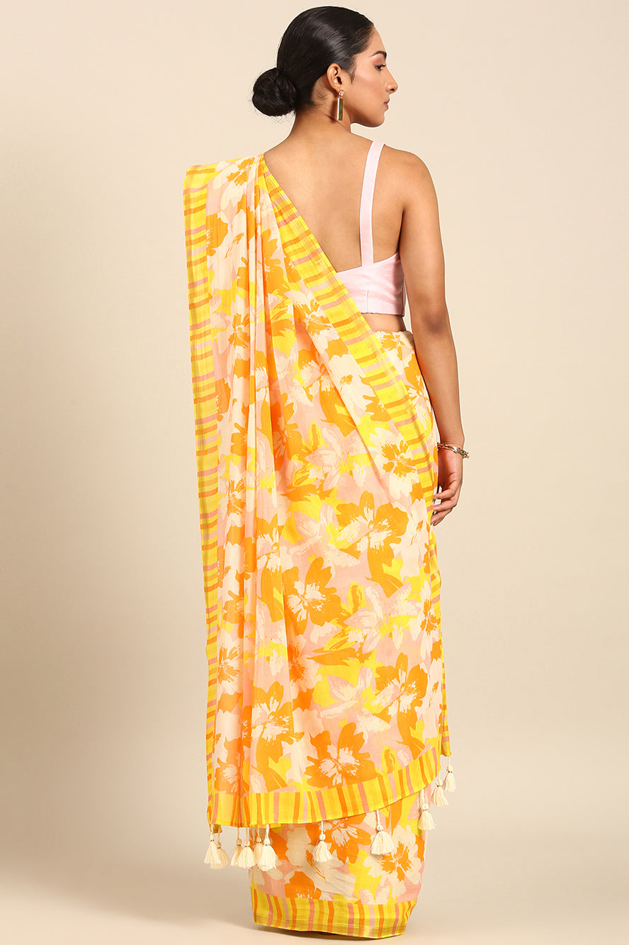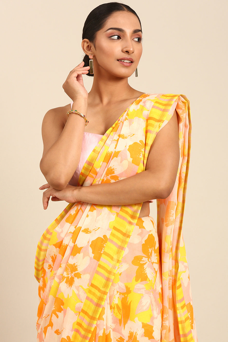 A celebration of color. This saree bursts with a vibrant abstract print in sunny yellow, pink, and orange. It’s a joyful, energetic design for those who love to stand out with confidence.