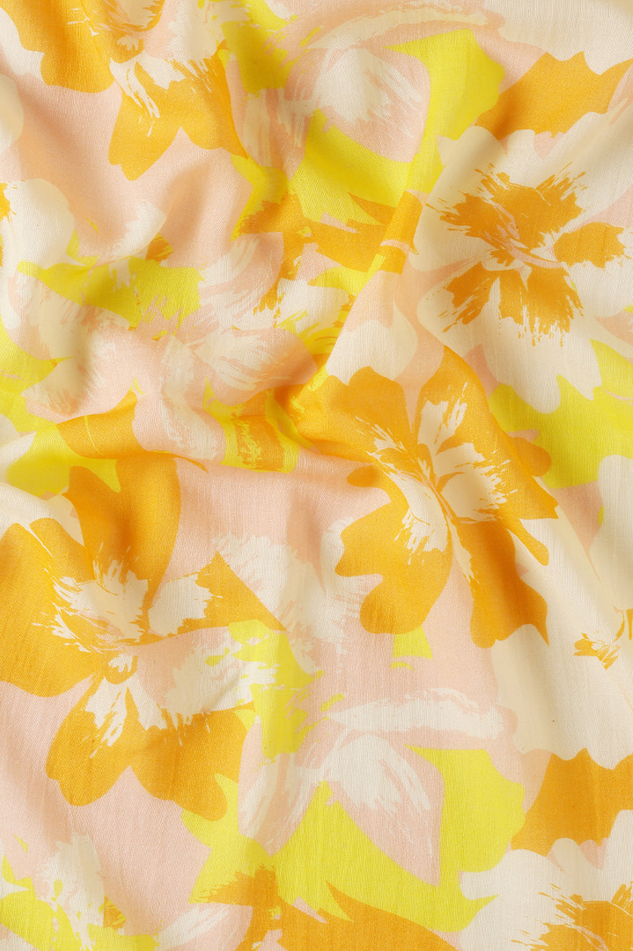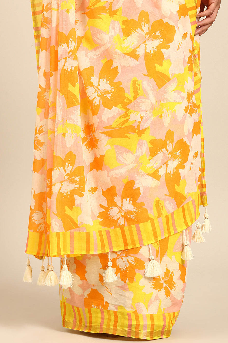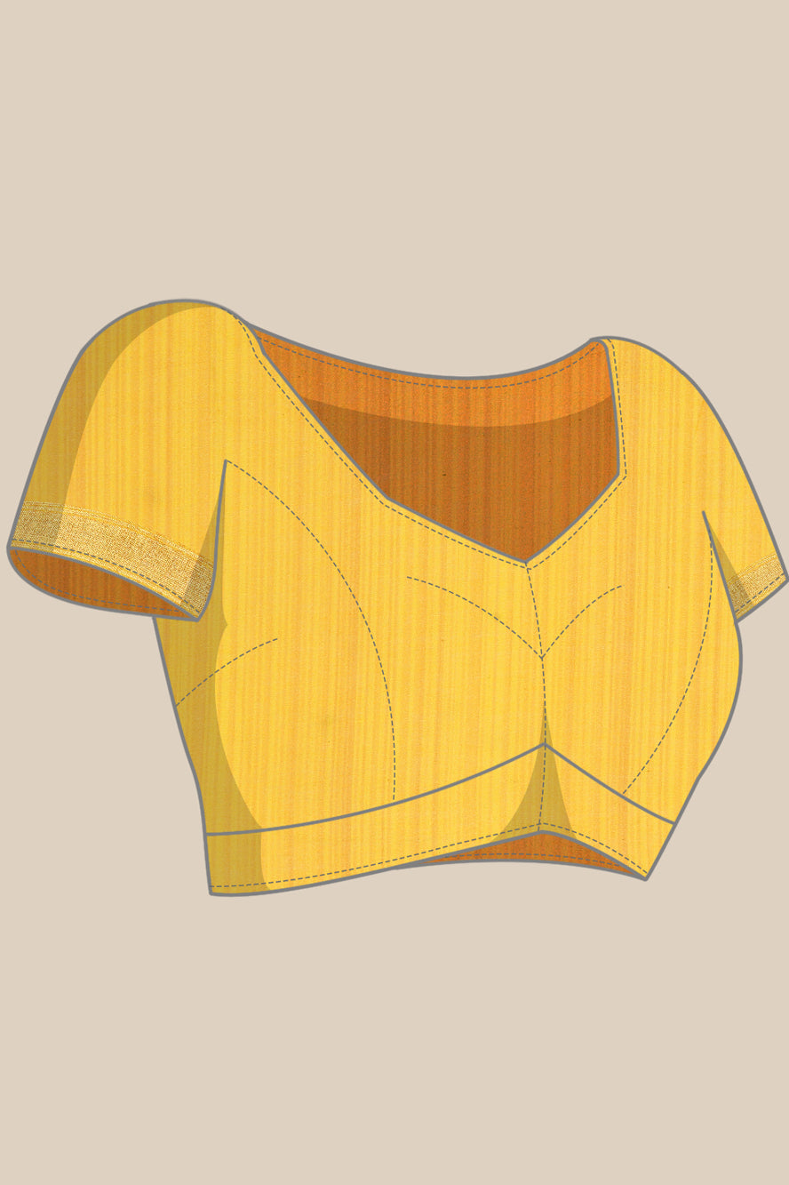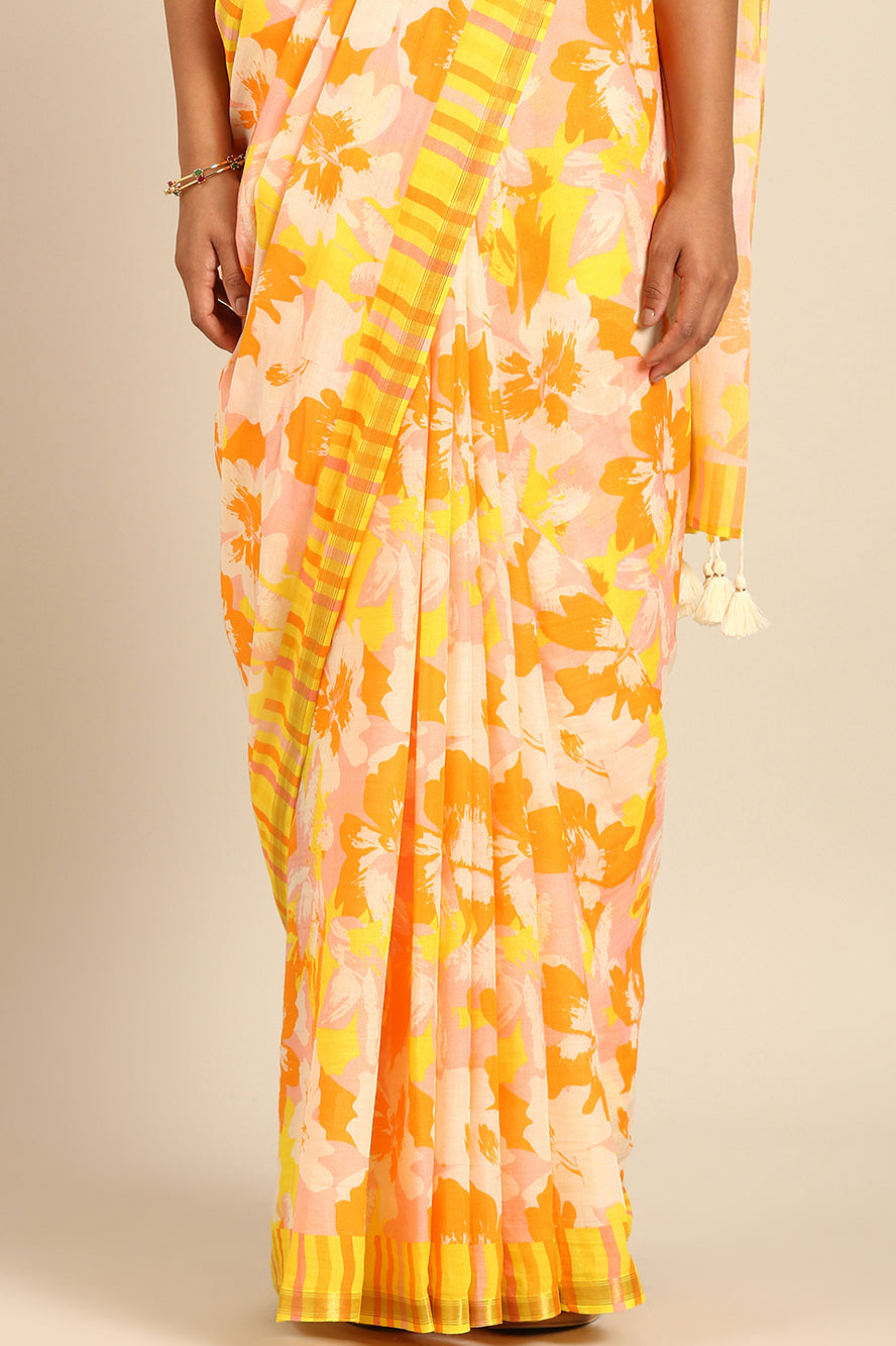 A celebration of color. This saree bursts with a vibrant abstract print in sunny yellow, pink, and orange. It’s a joyful, energetic design for those who love to stand out with confidence.