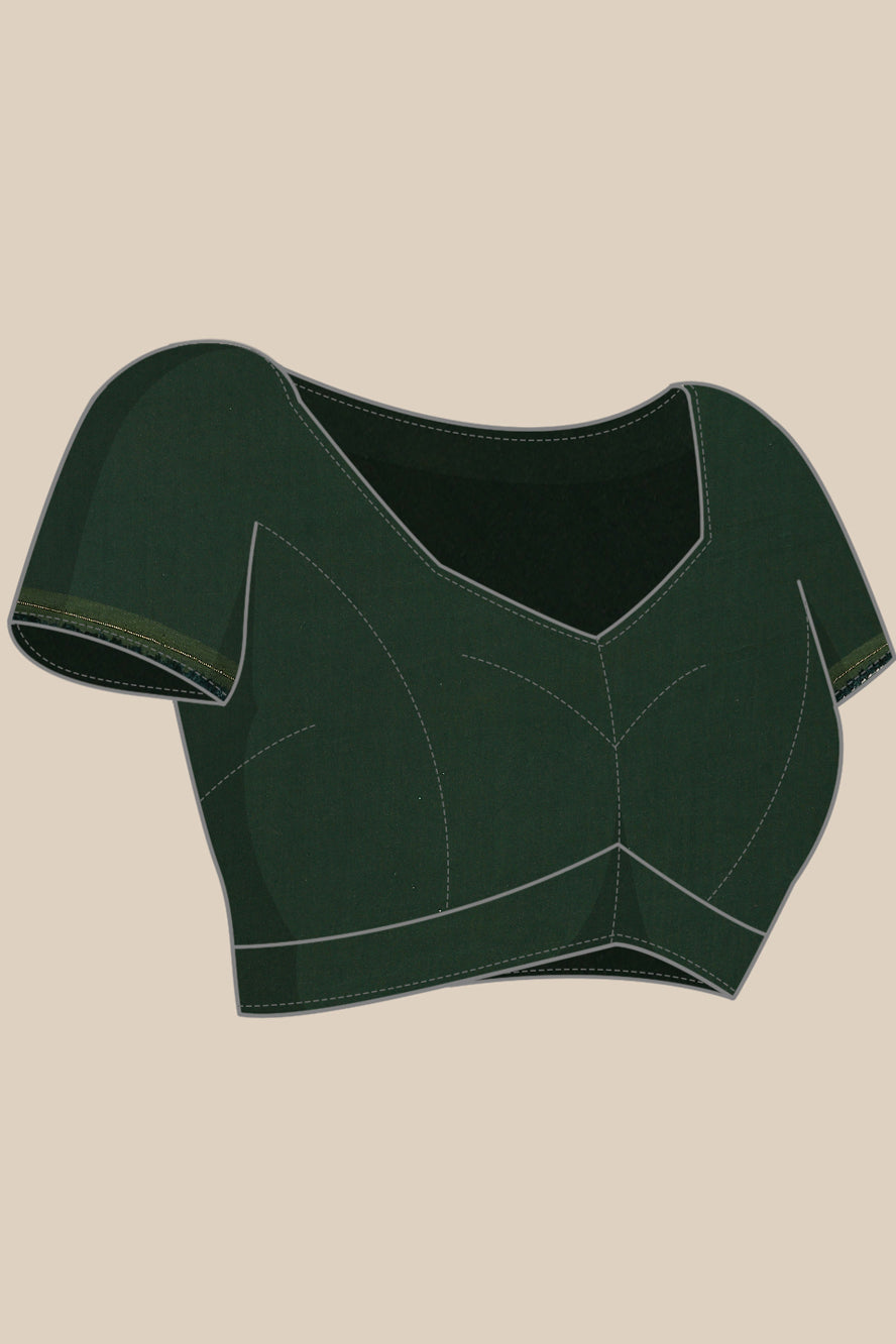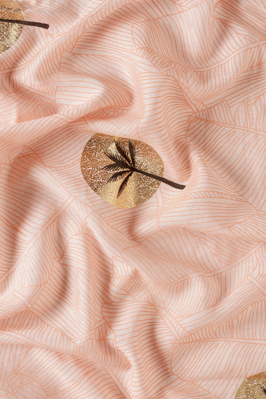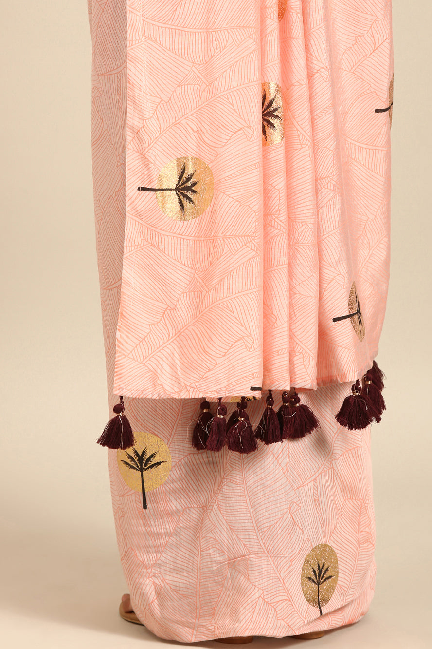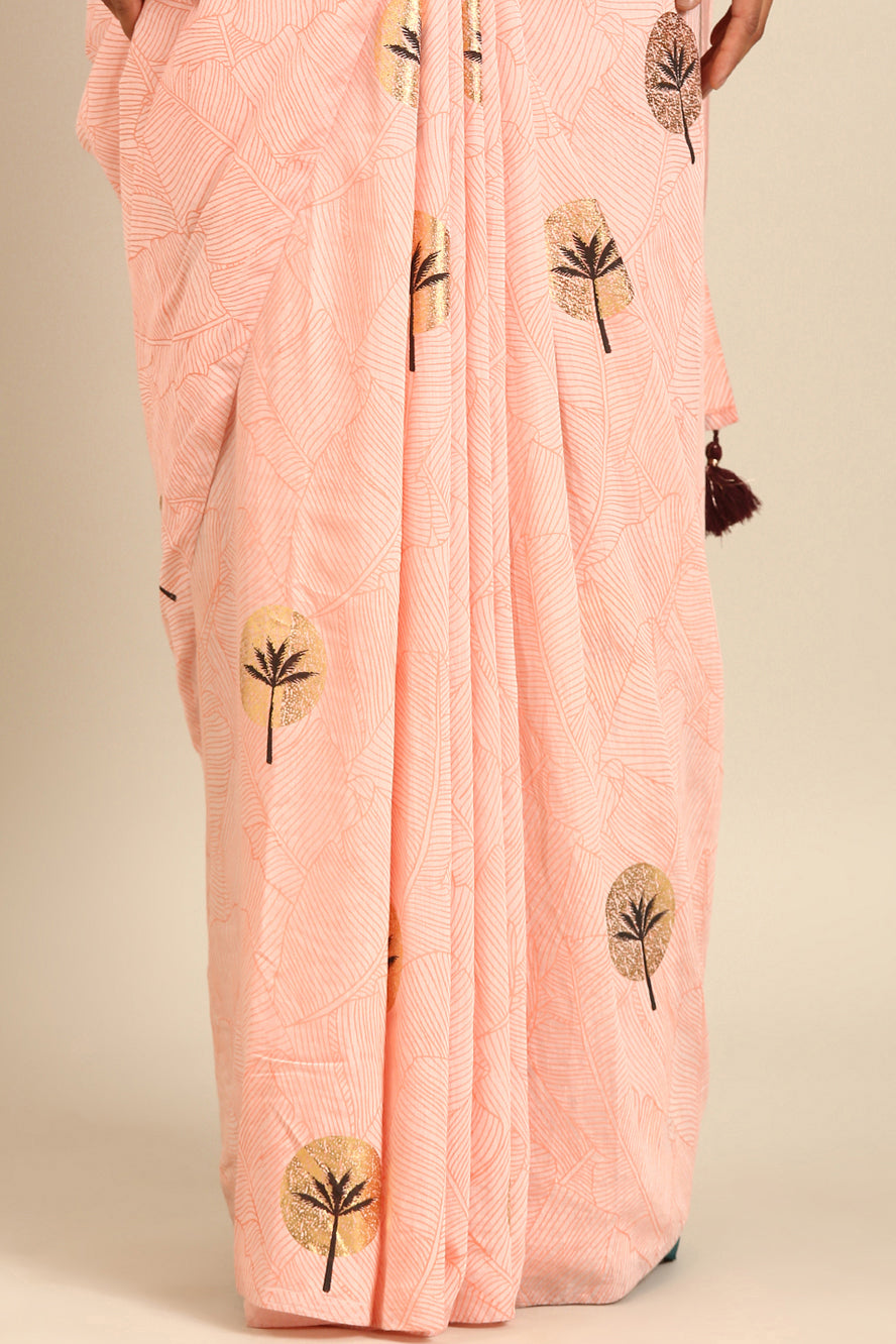 Softness with a metallic punch. A delicate light pink base is transformed with a glamorous gold foil print and zari border. This saree is for those who love a blend of feminine charm and contemporary sparkle.